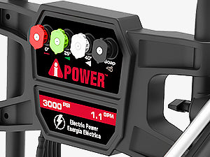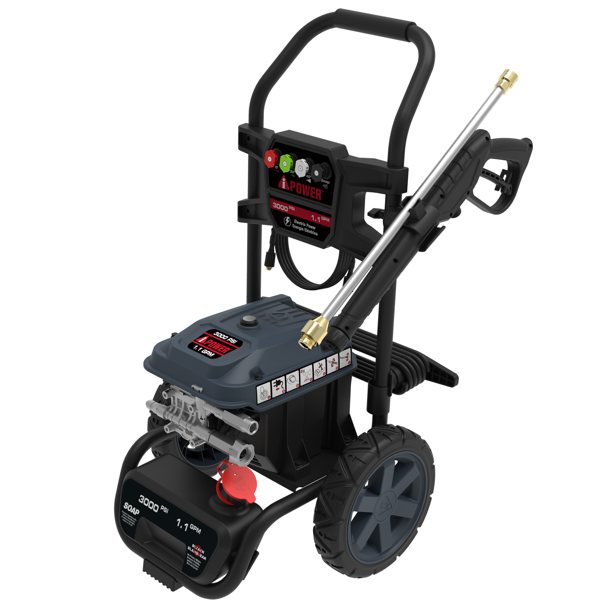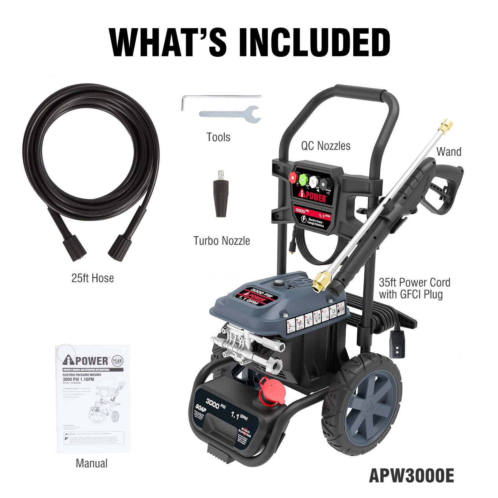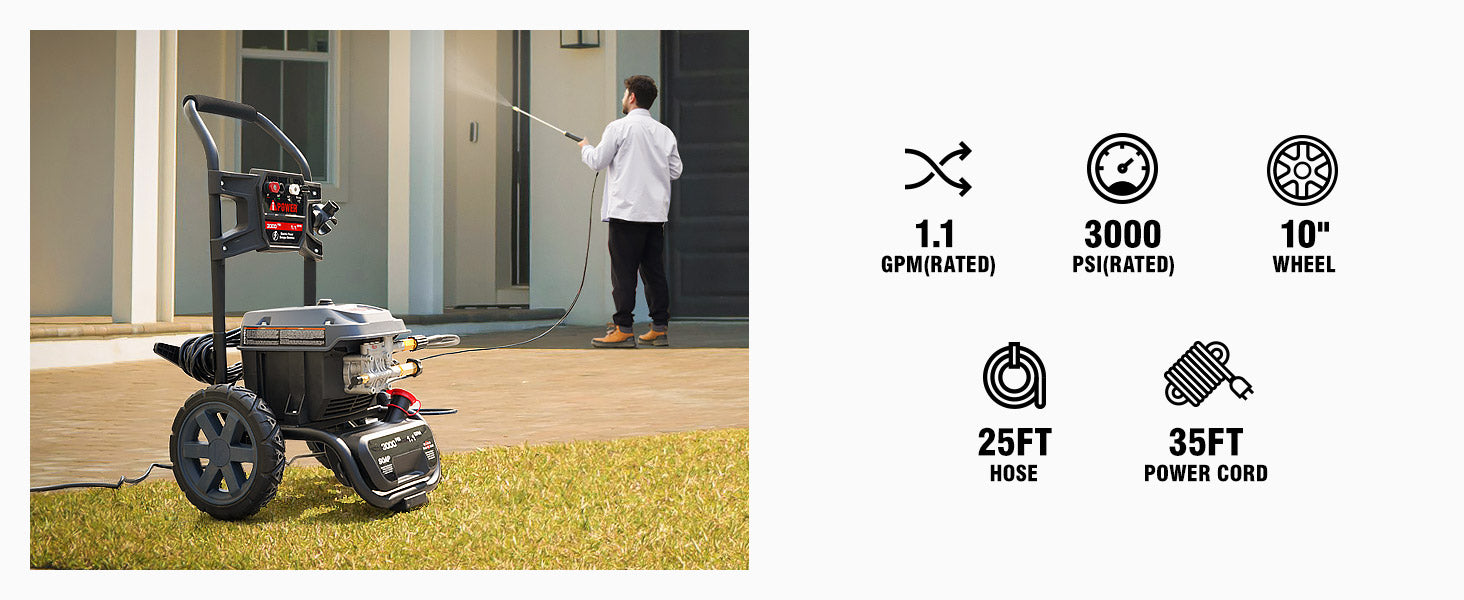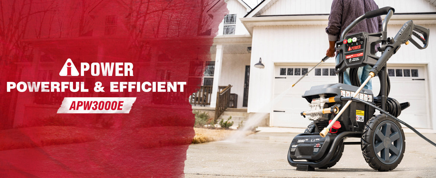 The A-iPower APW3000E Electric Pressure Washer offers high output with 3000 PSI at 1.1 GPM for outstanding cleaning power. The unit features a GFCI-equipped power cord with a push-button starting system for quick, safe, and convenient use.