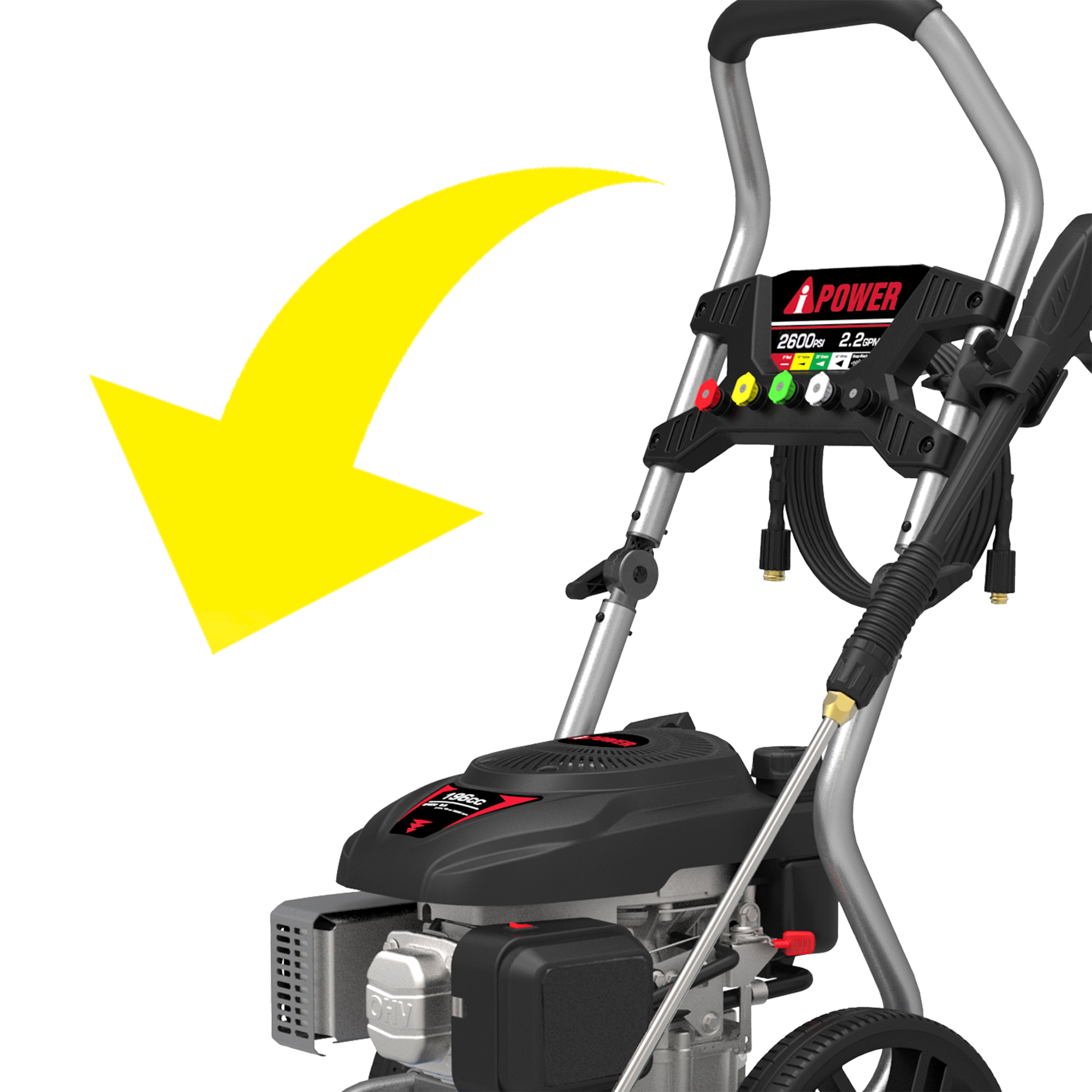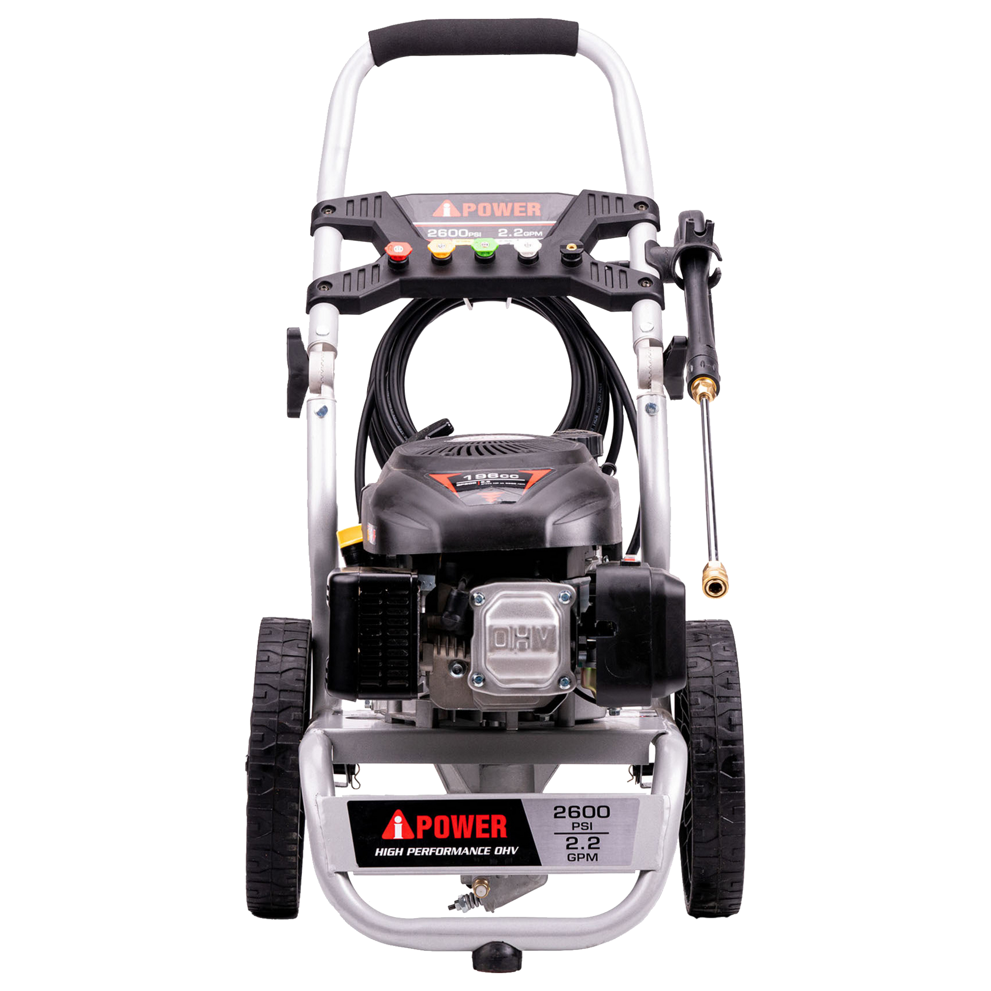 The EPA Certified A-iPower PWF2600SV 2600 PSI Pressure Washer has 2,600 PSI at 2.2 GPM, with a Senci SP200 Vertical, 196cc engine. The engine’s cast iron sleeves provide durability and extended run life, while the low oil shut down automatically protects the engine from potential damage.