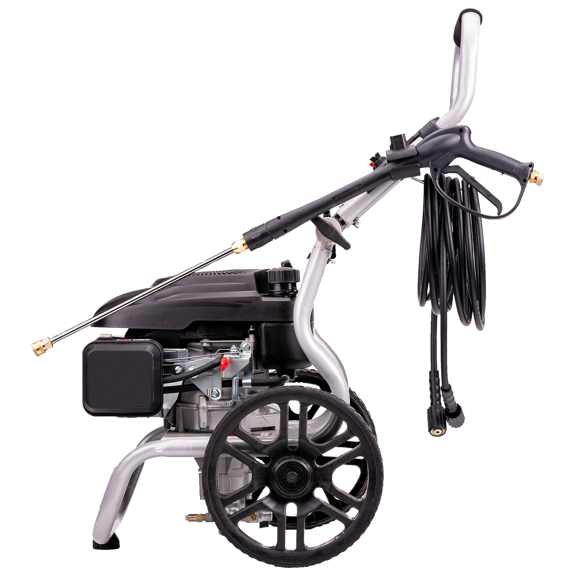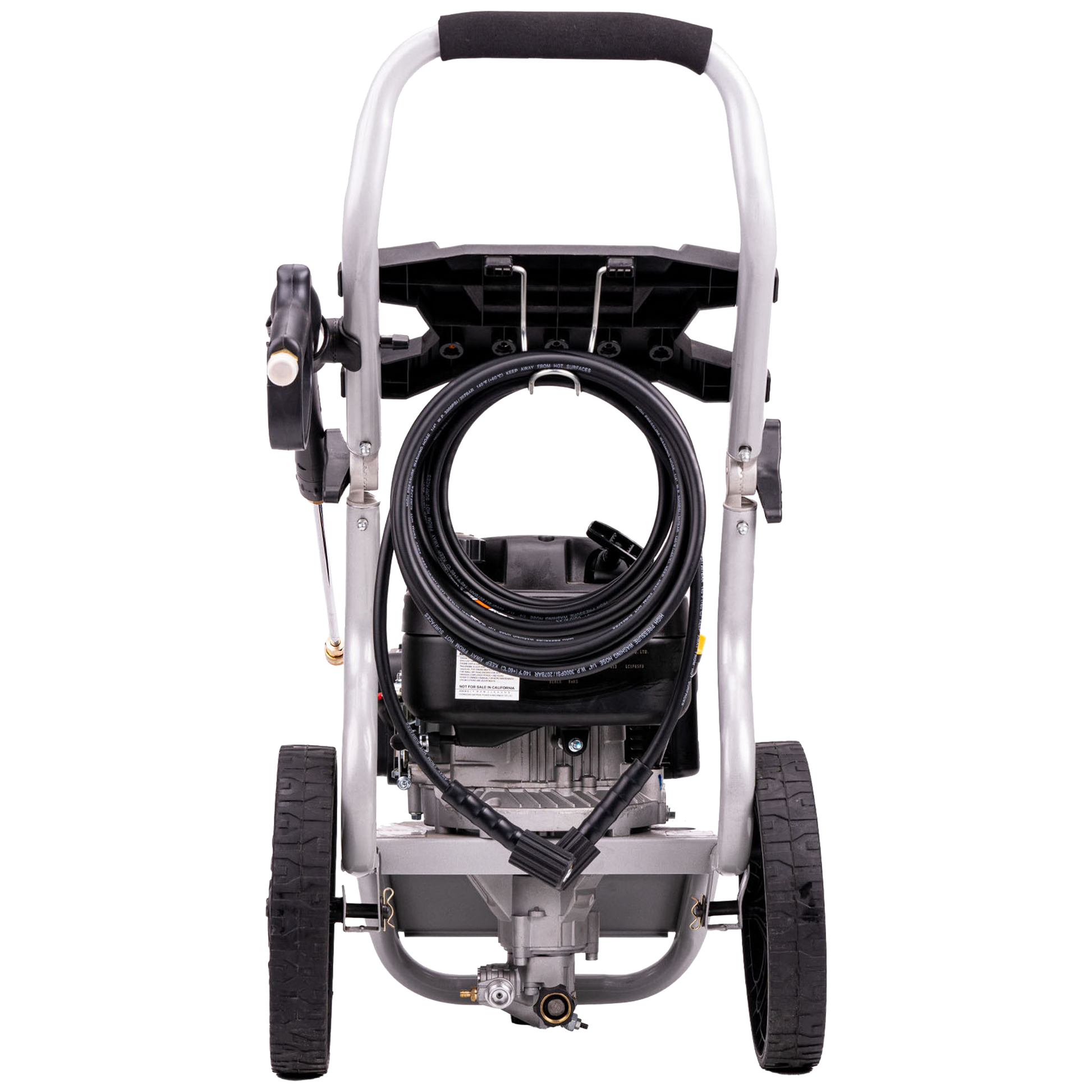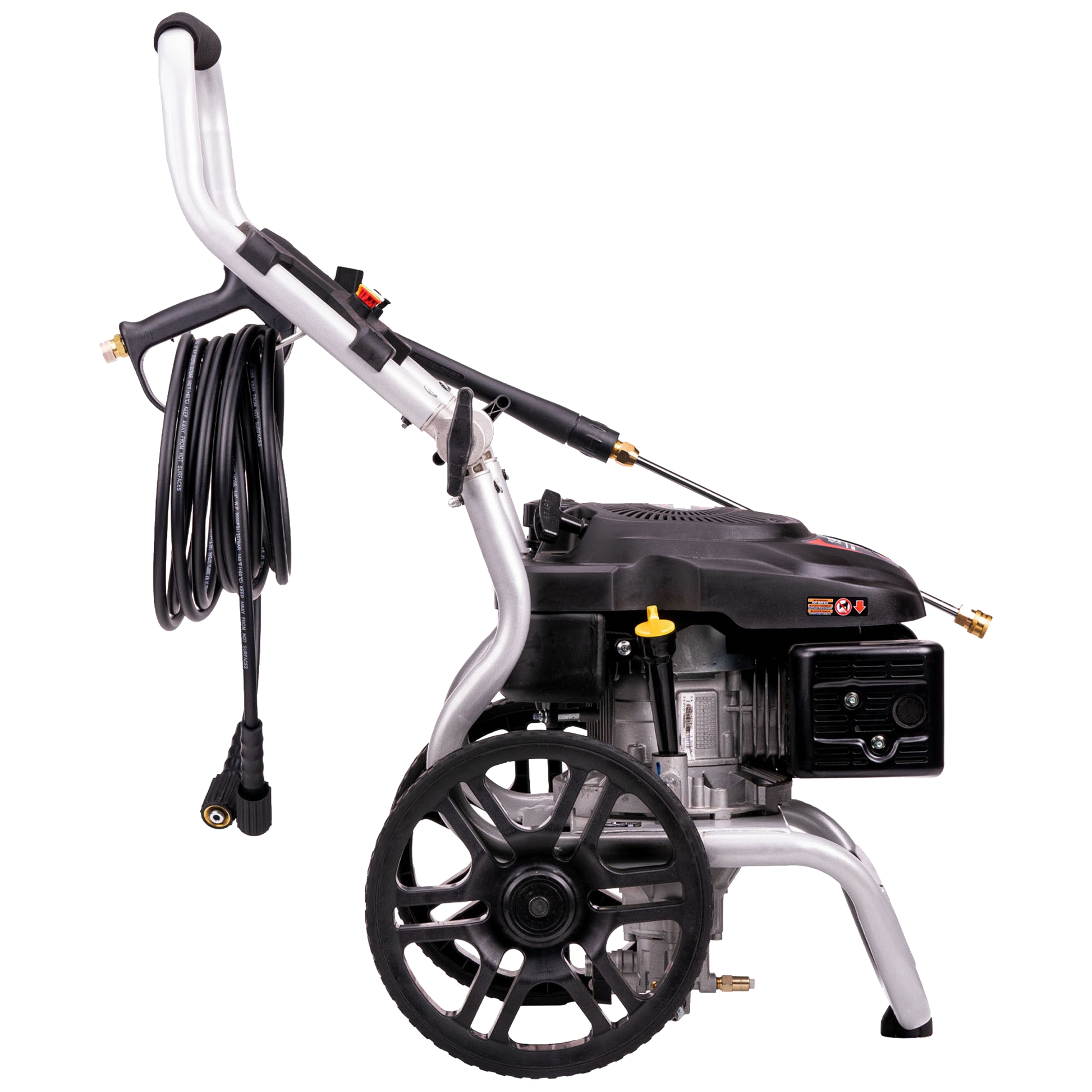 With an easy-to-pull recoil start, an ergonomically designed grip helps provide an effortless start. A low tone muffler with a USDA approved spark arrestor provides quieter operation. The unit features a one-click quick assembly frame and a .37-gallon, heavy duty all steel construction fuel tank. The pressure washer has an attractive high quality, silver, powder coat finish that is rustproof and a 1.1-inch diameter rigid tubular steel frame with an attractive dark grey powder coat finish.