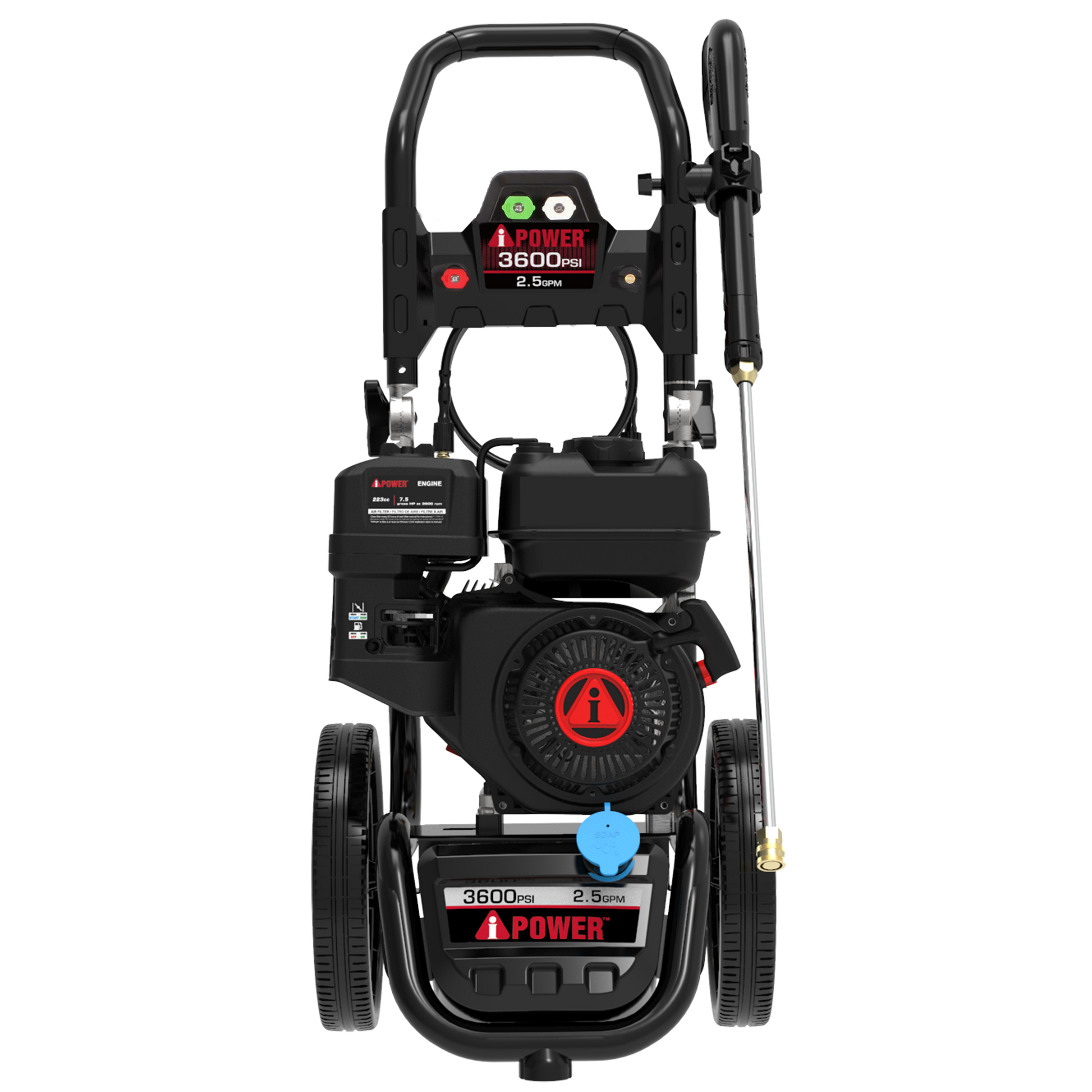 The A-iPower PWF3600SH provides high output 3600 PSI at 2.5 GPM for outstanding cleaning power. With a performance series 223cc OHV horizontal shaft engine, the unit features a robust pump with an axial cam, stainless steel pistons, and a relief valve.