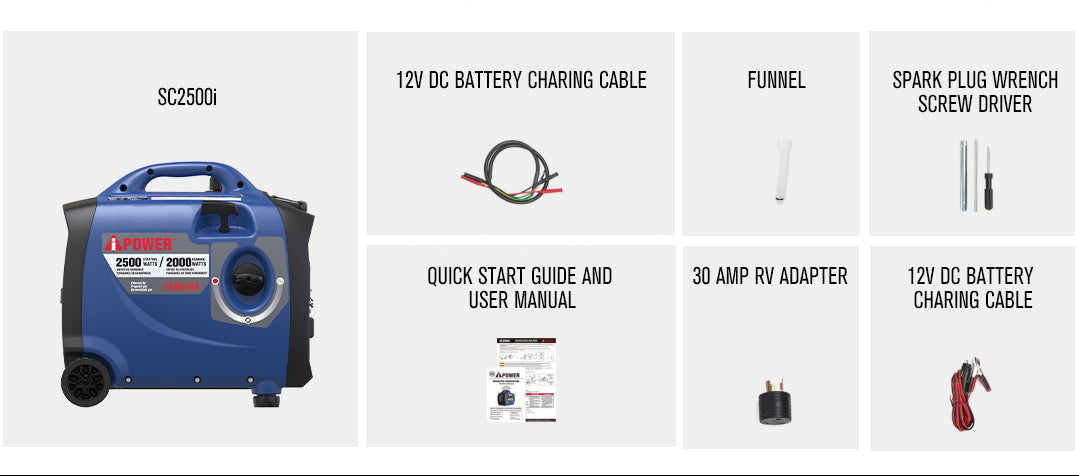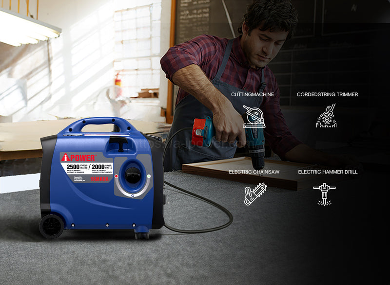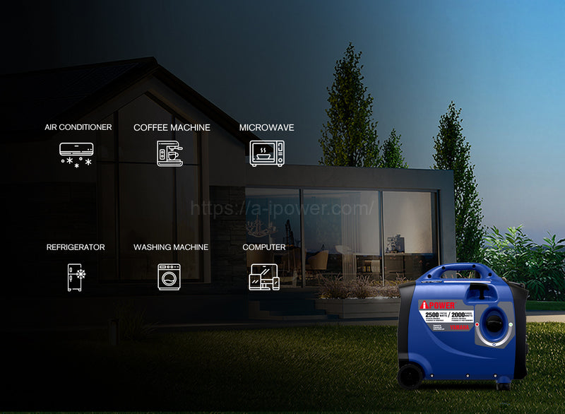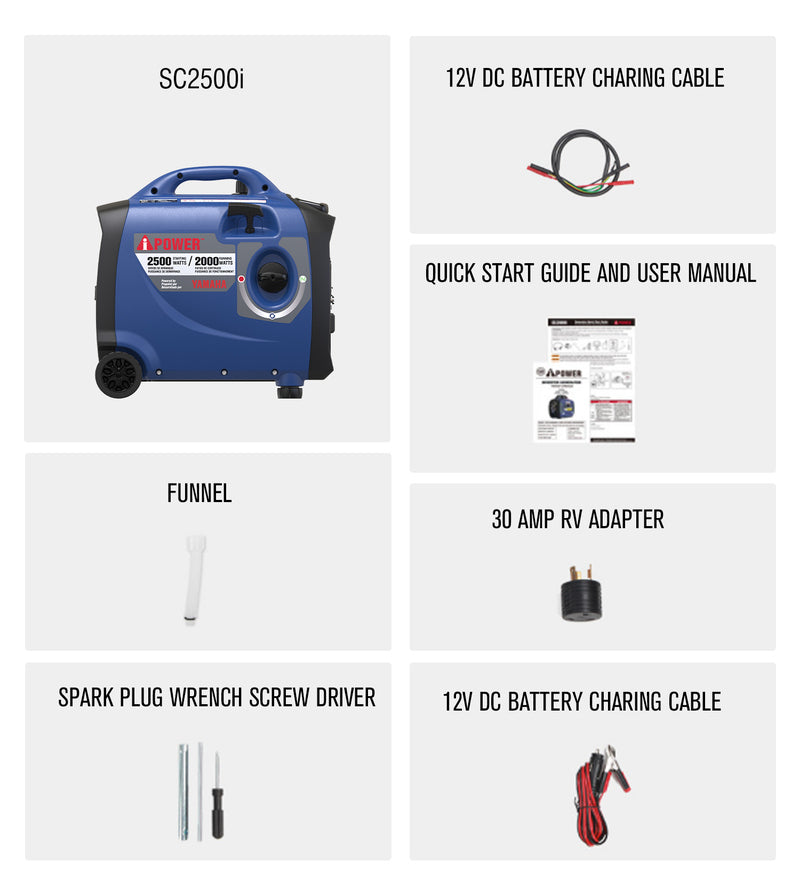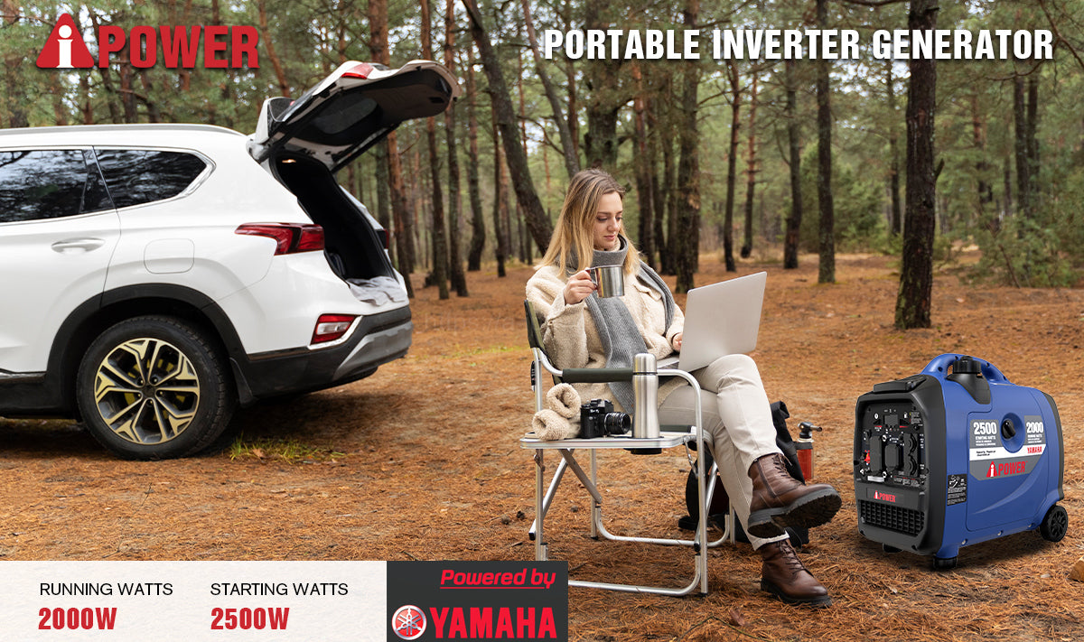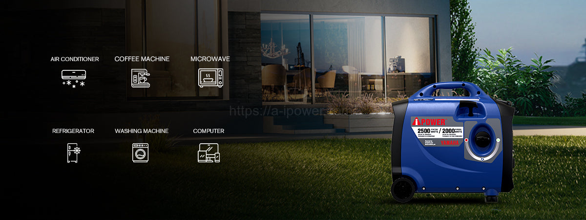 | The A-iPower SC2500i, powered by an 80cc OHV high-performance four-cycle Yamaha engine offers 2,500 starting watts and 2,000 running watts, with <3% THD of clean power output, keeping sensitive electronics safe. With an extended run time of 9 hours at 25% load, the unit features parallel ports for double the power output when linked together. The compact, lightweight design makes it easy to transport with an integrated telescopic handle and no-flat wheels, plus the inverter offers quiet operation, making it ideal for home, camping, tailgating, and RVing. The unit also has a built-in LED control panel light and a CO sensor with automatic shutdown, as it monitors and reacts to carbon monoxide (CO) levels. | Regular price