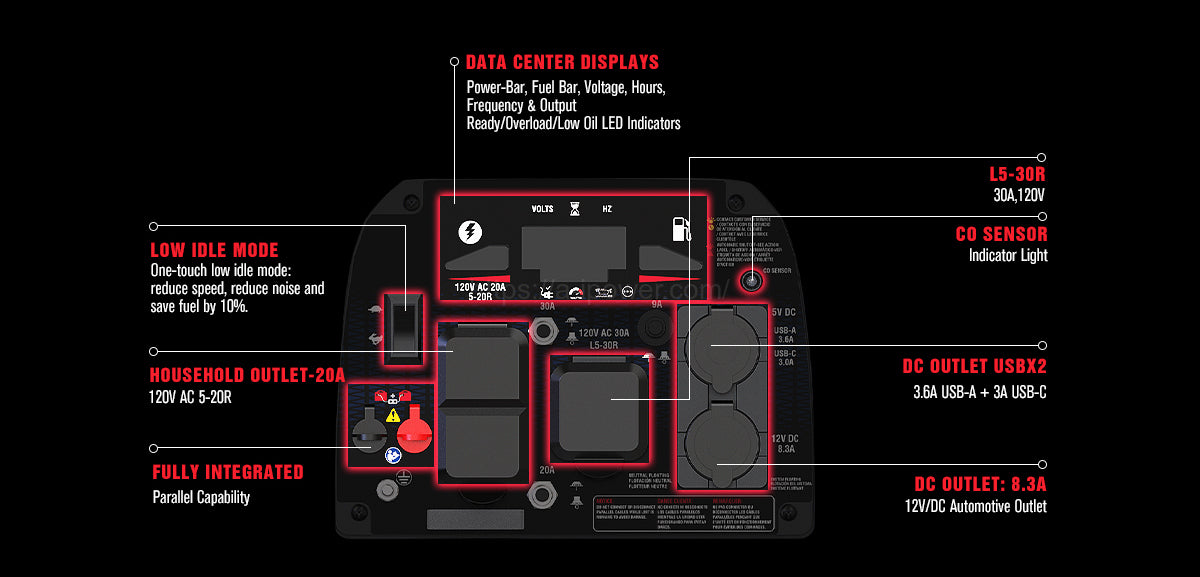 | Data Center | Power Bar, Fuel Bar, Voltage, Hours, Frequency & Output, Ready/Overload/Low Oil, LED Indicators |