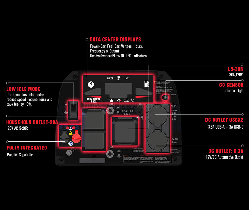 The compact, lightweight design makes it easy to transport with an integrated telescopic handle and no-flat wheels, plus the inverter offers quiet operation, making it ideal for home, camping, tailgating, and RVing. The unit also has a built-in LED control panel light and a CO sensor with automatic shutdown, as it monitors and reacts to carbon monoxide (CO) levels.