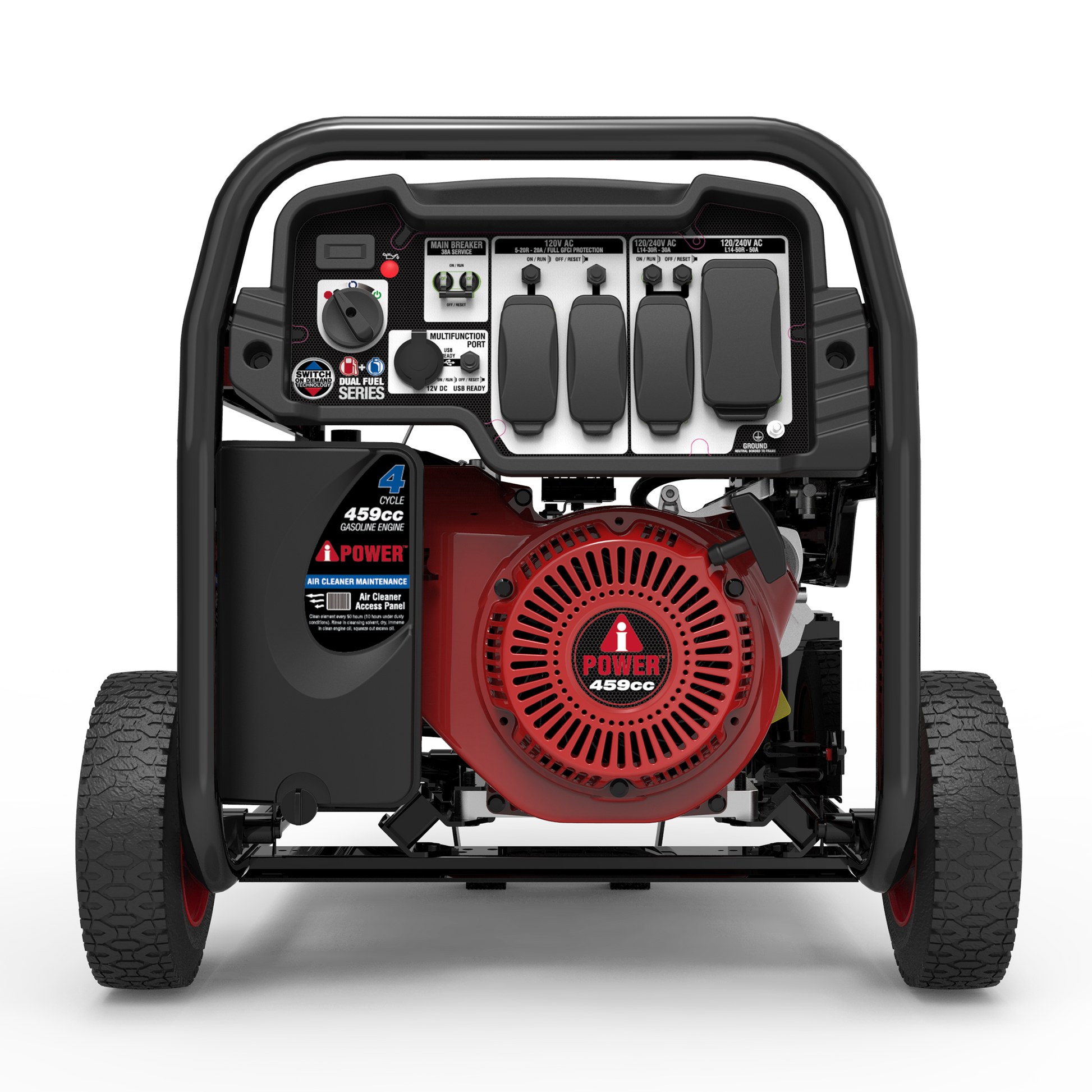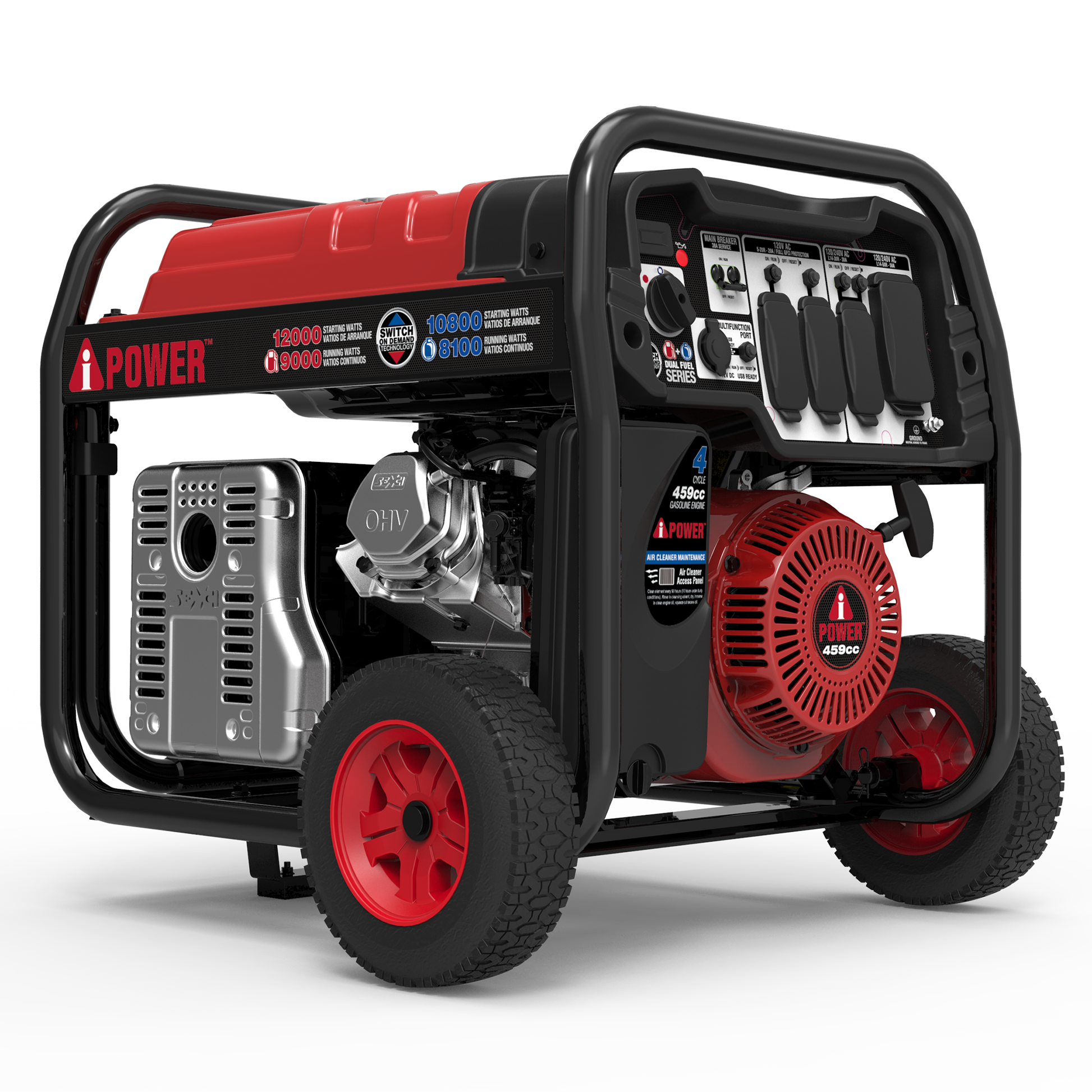 The A-iPower SUA12000ED 12000-Watt Dual Fuel Generator has a 459cc OHV performance series engine with a cast iron sleeve and low oil shutdown. With 12,000 starting watts and 9,000 running watts on gasoline and 10,800 starting watts and 8,100 running watts on propane, the unit’s 7-gallon fuel tank offers an extended run time of 14 hours at 25% load.