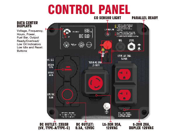 | Data Center | Voltage, Frequency, Hours, Power, Fuel Bar, Output Ready/ Overload/Low Oil indicators Low Idle and Reset Buttons |