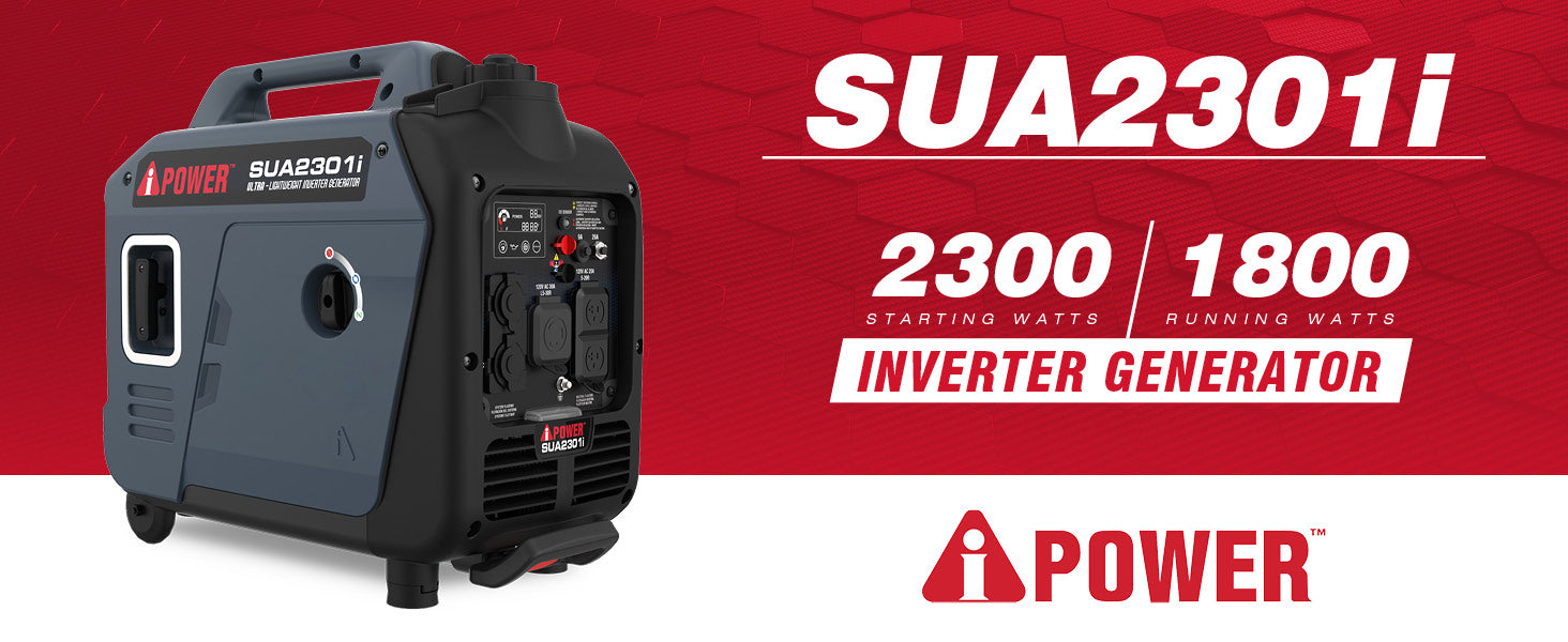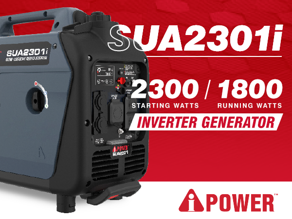 The newly designed A-iPower SUA2301i Inverter Generator is powered by an 80cc OHV high performance 4-cycle engine that offers 2,300 starting watts and 1,800 running watts. At <3% THD of clean power output, it keeps sensitive electronics safe. With low idle technology and an extended run time of 9 hours at 25% load, the unit has parallel ports for double the power output when linked together. Operating at as low as 52 dB, this inverter is ideal for home, camping, tailgating, and Rving. The ultra lightweight unit features a built-in LED control panel light, a factory installed telescoping handle and wheels for easy mobility, and digital data center lists voltage, frequency, hours, power and fuel levels, output/overload/oil level status, fuel saving low idle, and reset functions. | Regular price