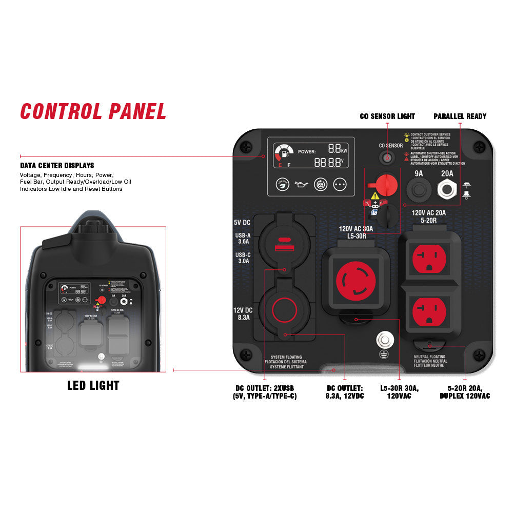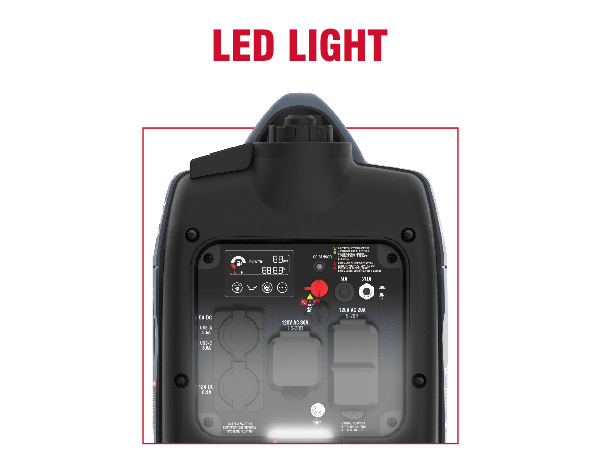 The ultra lightweight unit features a built-in LED control panel light, a factory installed telescoping handle and wheels for easy mobility, and digital data center lists voltage, frequency, hours, power and fuel levels, output/overload/oil level status, fuel saving low idle, and reset functions.