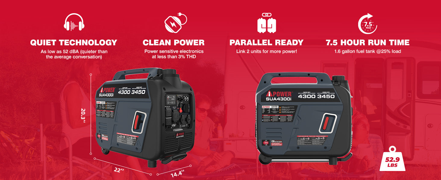 The newly designed A-iPower SUA2301i Inverter Generator is powered by an 80cc OHV high performance 4-cycle engine that offers 2,300 starting watts and 1,800 running watts. At <3% THD of clean power output, it keeps sensitive electronics safe.