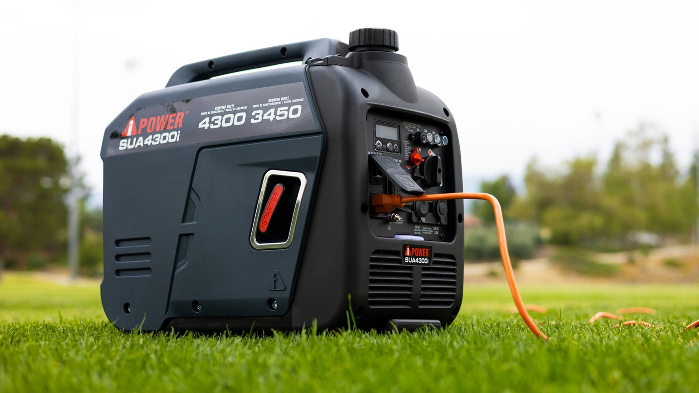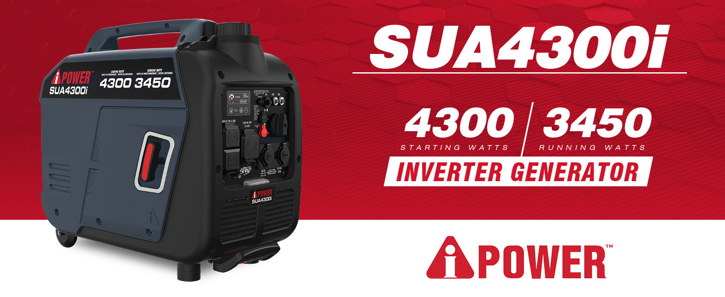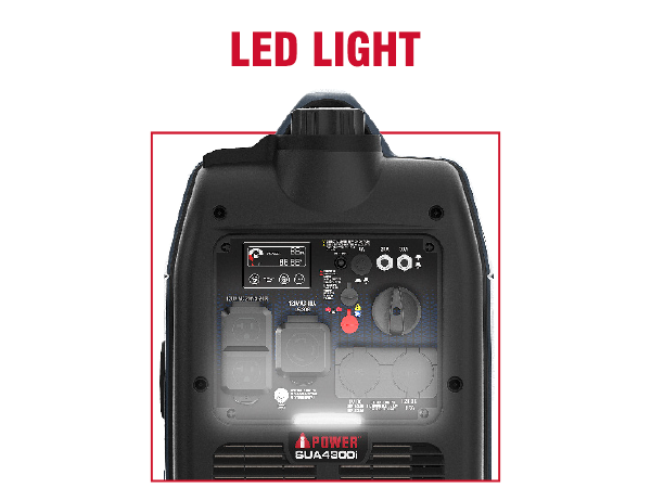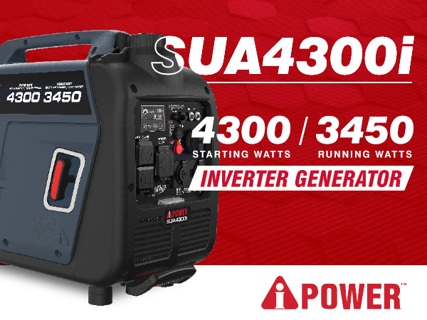 | The SUA4300i inverter generator has a 149cc OHV high performance 4 cycle engine, boasting 4,300 starting watts and 3,450 running watts on gasoline. Providing <3% THD of clean power output, the unit keeps sensitive electronics safe. Featuring low idle technology, the inverter adjusts RPM based on demand, saving fuel. The unit includes factory installed telescopic handle and wheels (no assembly required), a built-in LED control panel light, and a CO Sensor with automatic shutdown, as the unit is monitored and reacts to carbon monoxide (CO) levels. Lightweight and easy to transport with an integrated handle, this ultra-quiet inverter is ideal for home, camping, tailgating, and Rving. | Regular price