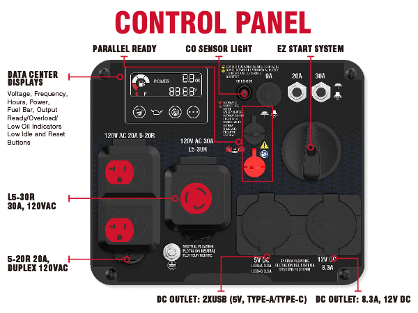 Featuring low idle technology, the inverter adjusts RPM based on demand, saving fuel. The unit includes factory installed telescopic handle and wheels (no assembly required), a built-in LED control panel light, and a CO Sensor with automatic shutdown, as the unit is monitored and reacts to carbon monoxide (CO) levels.