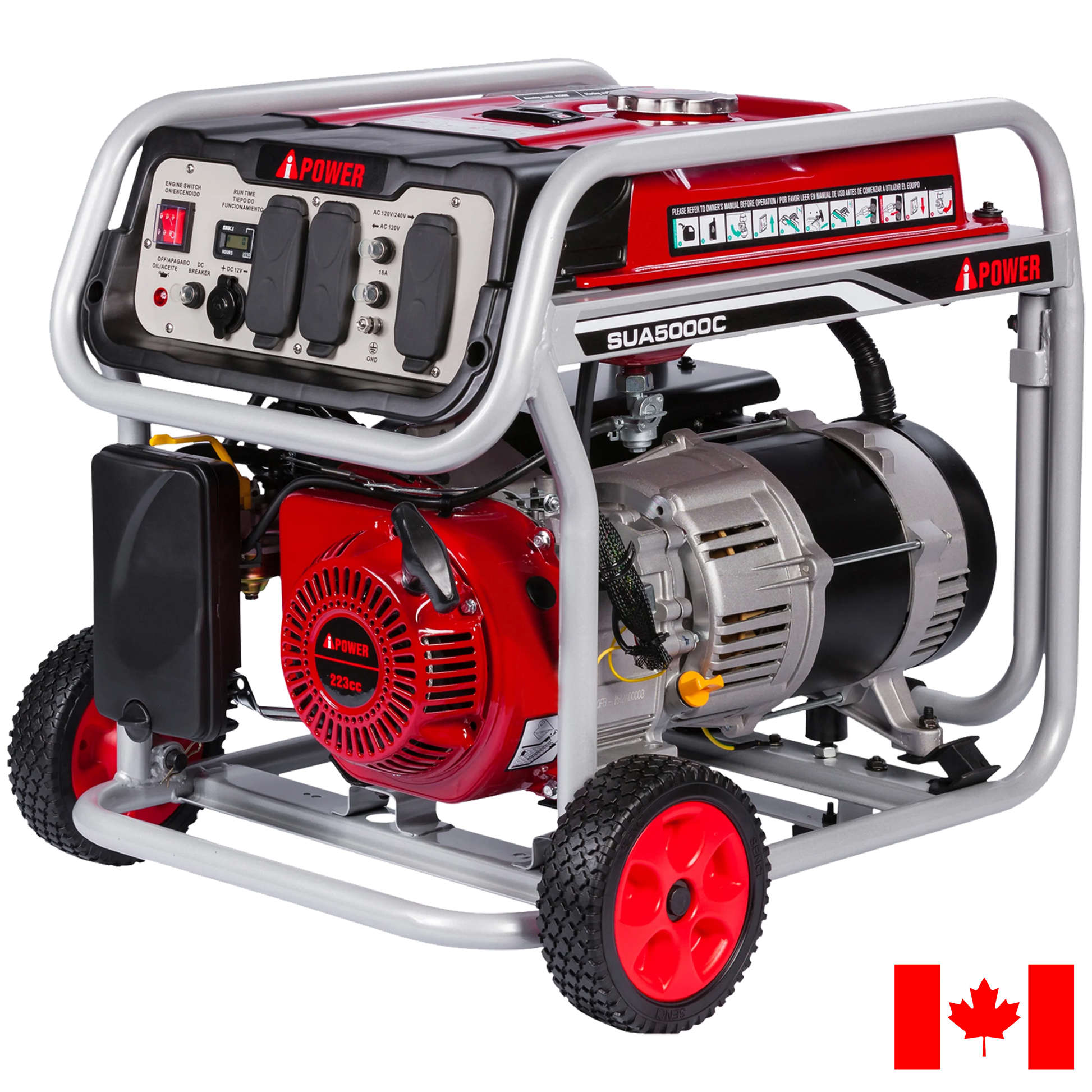 The A-iPower SUA5000C has 5,000 starting watts with 4,250 running watts to power your tools at the construction site, camping ground, or household appliances. With an easy-pull recoil start, its powerful 223 cc 7.5HP OHV 4 stroke engine comes with a low oil alert light and low oil automatic shutdown to keep your generator performing year after year. The 4-gallon gasoline fuel tank provides an average run time of 9 hours at 50% load. Featuring a fold down handle, the unit has rigid tubular steel frame with attractive silver-grey powder coat finish.