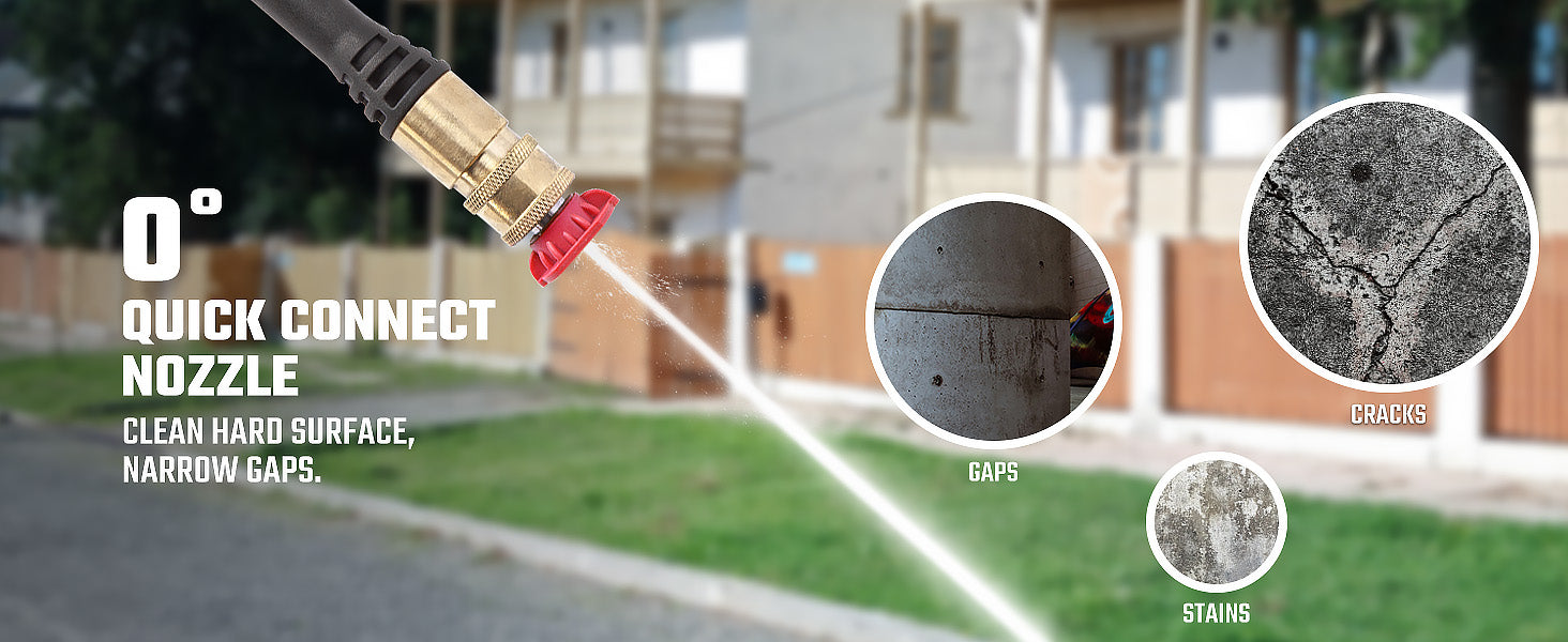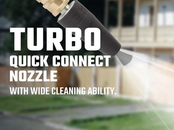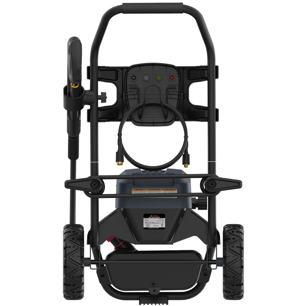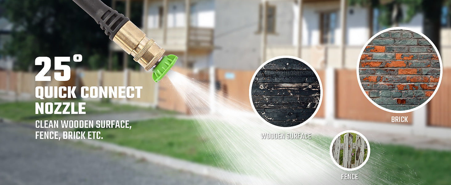 The unit features a three-piston axial pump for durable, long-term use. The extra-long 25' long co-extrude high-pressure hose provides an easy-to-move workspace. There are four pro-style nozzles, including a turbo nozzle and integrated soap tank for efficient cleaning power. The lightweight pressure washer, with 8'' never flat wheels, weighs only 28.7 pounds, allowing for convenient storage and effortless portability