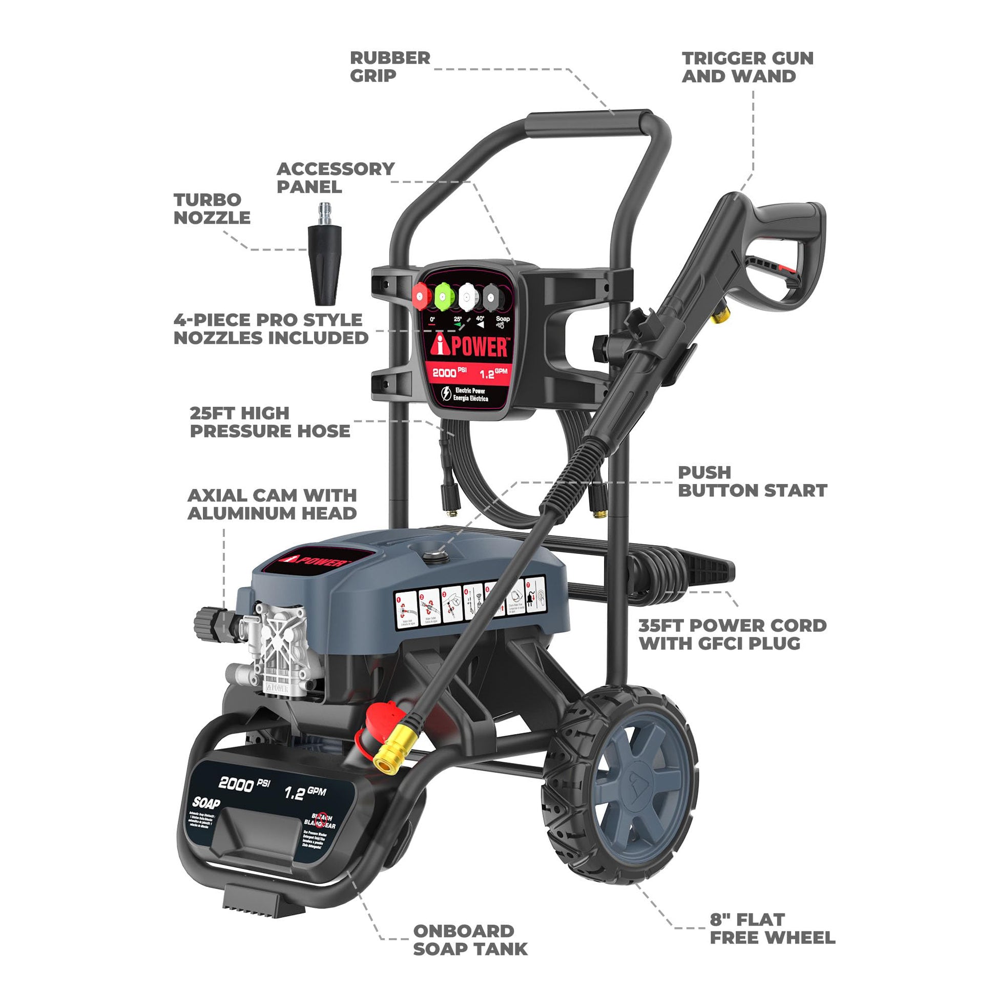 | The APW2000E PSI Electric Pressure Washer offers 2000 PSI at 1.2 gallons per minute for outstanding cleaning power. Equipped with an AC plug, the push-button starting system offers quick and convenient use, with a GFCI-protected power cord. The unit features a three-piston axial pump for durable, long-term use. The extra-long 25' long co-extrude high-pressure hose provides an easy-to-move workspace. There are four pro-style nozzles, including a turbo nozzle and integrated soap tank for efficient cleaning power. The lightweight pressure washer, with 8'' never flat wheels, weighs only 28.7 pounds, allowing for convenient storage and effortless portability | Regular price