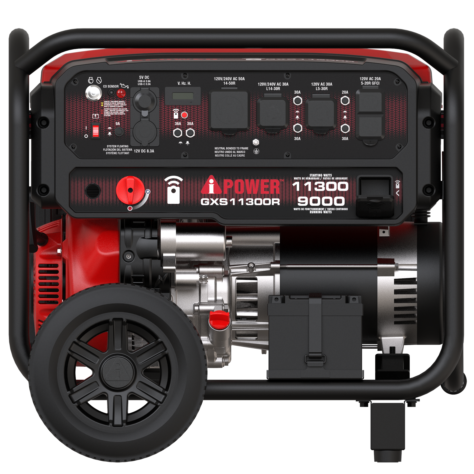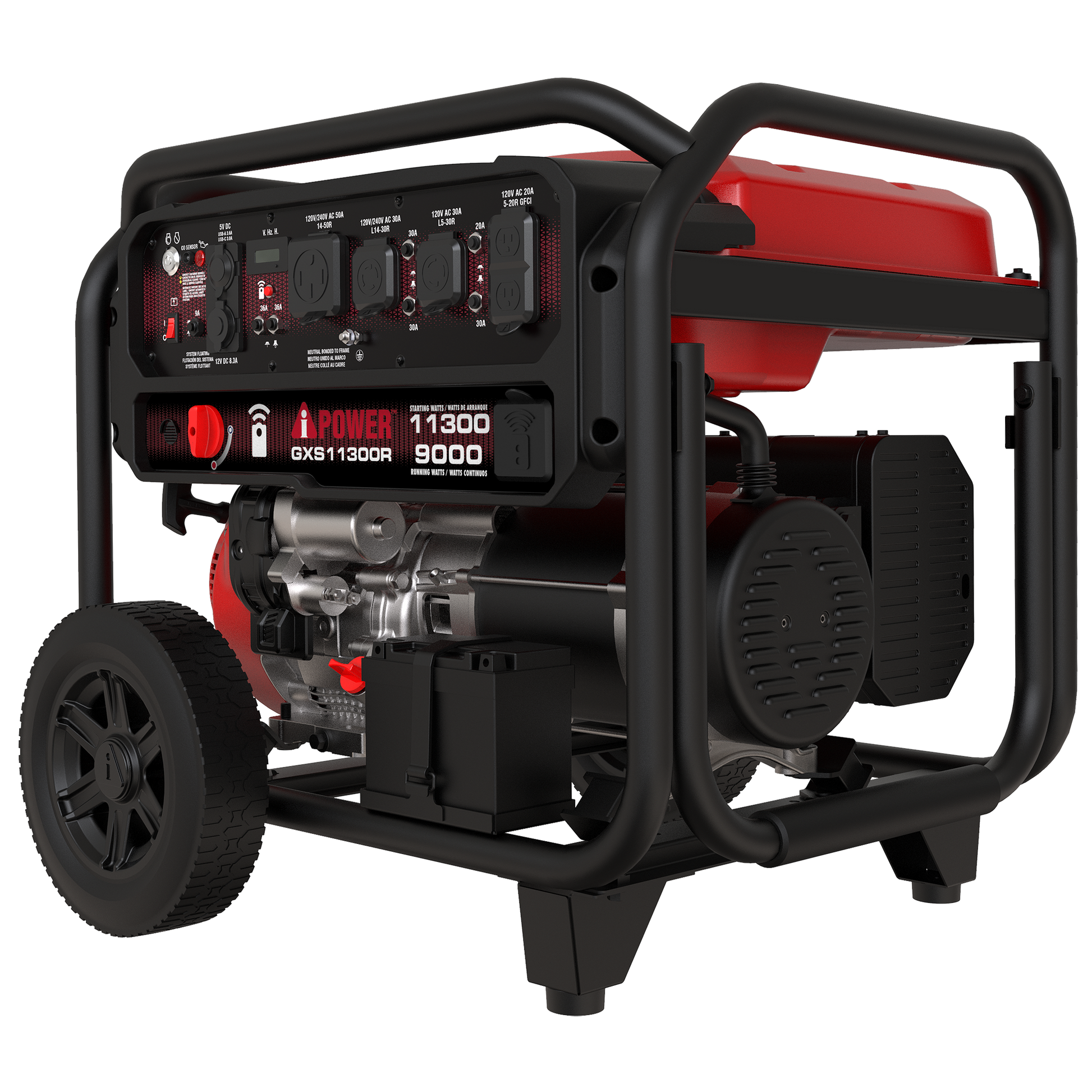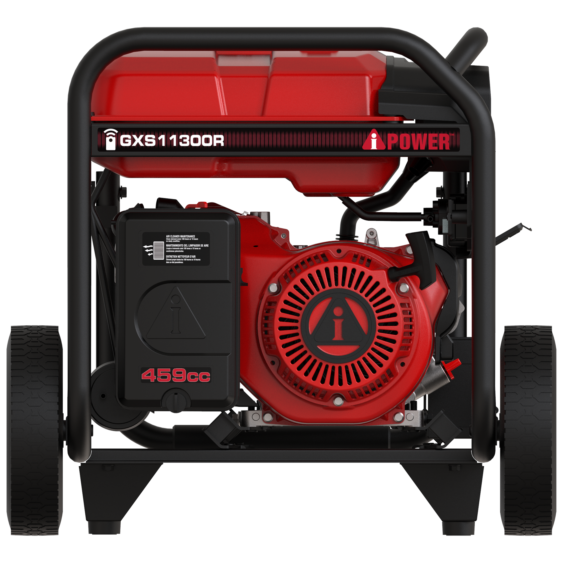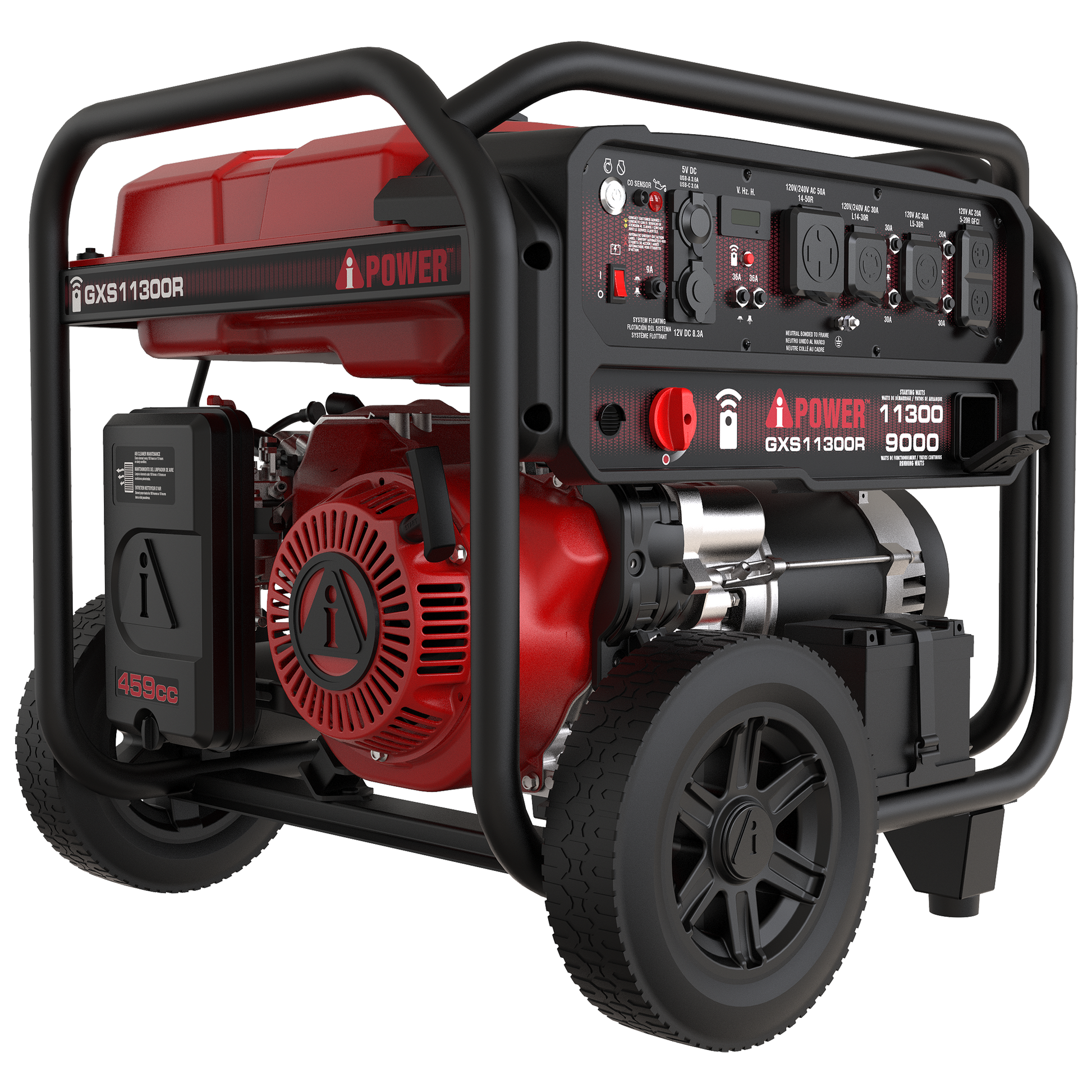Featuring a 459cc OHV engine with cast iron sleeve and low oil shutdown, the GXS11300R Remote Control Portable Generator has 11,300 starting watts and 9,000 running watts on gasoline. The 9.5-gallon fuel tank provides an extended run time of up to 18 hours at 25% load. It offers simple starting through recoil, electric, and remote start, plus a battery and fob is included.
