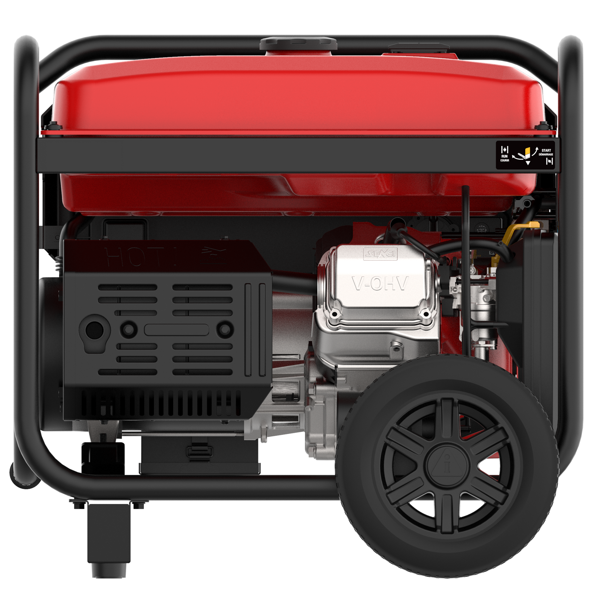 The easy-to-transport generator has a folding handle and wheels included, a CO Sensor with auto shutdown that monitors and reacts to carbon monoxide (CO) levels, and has recoil, electric, and remote start, with the fob and battery included.