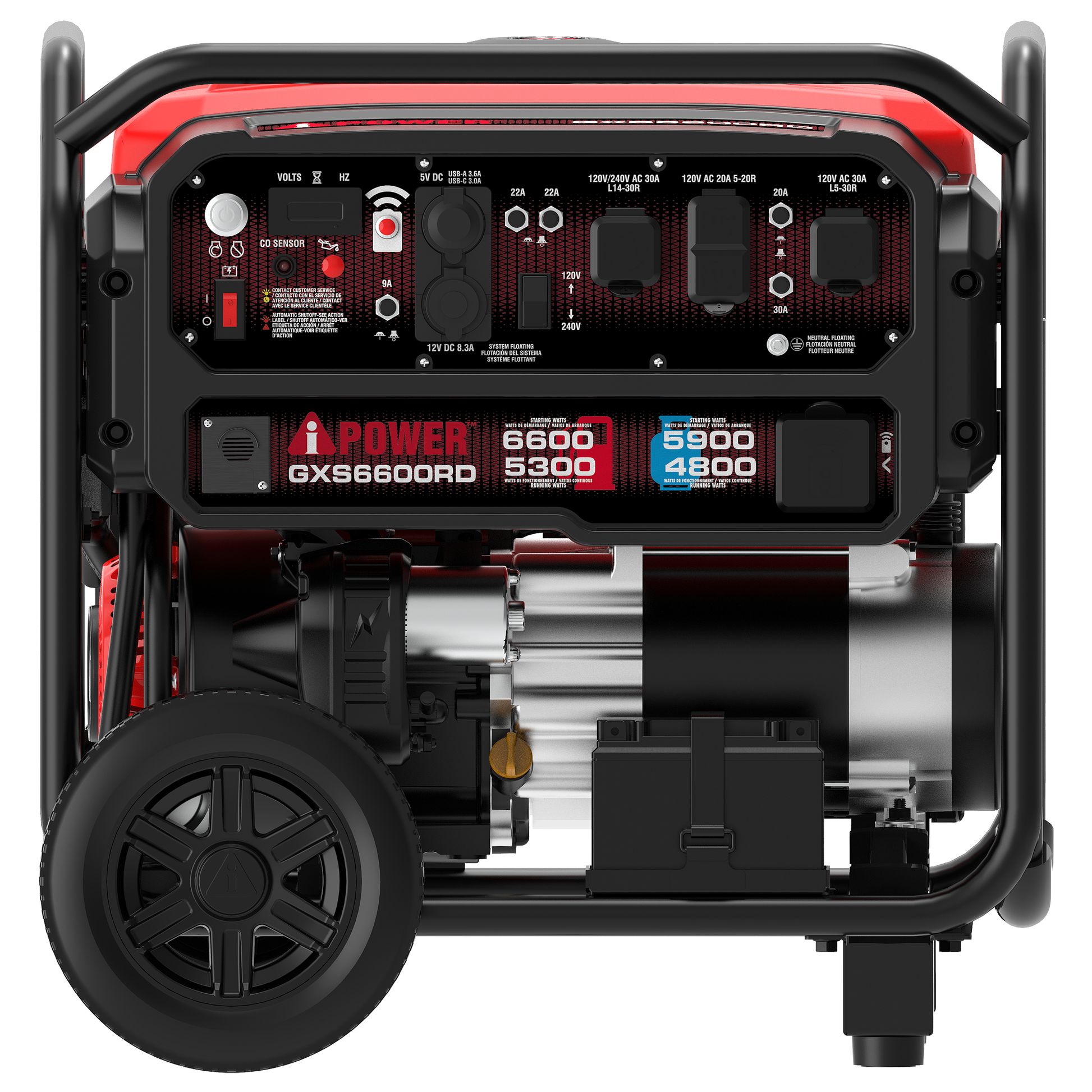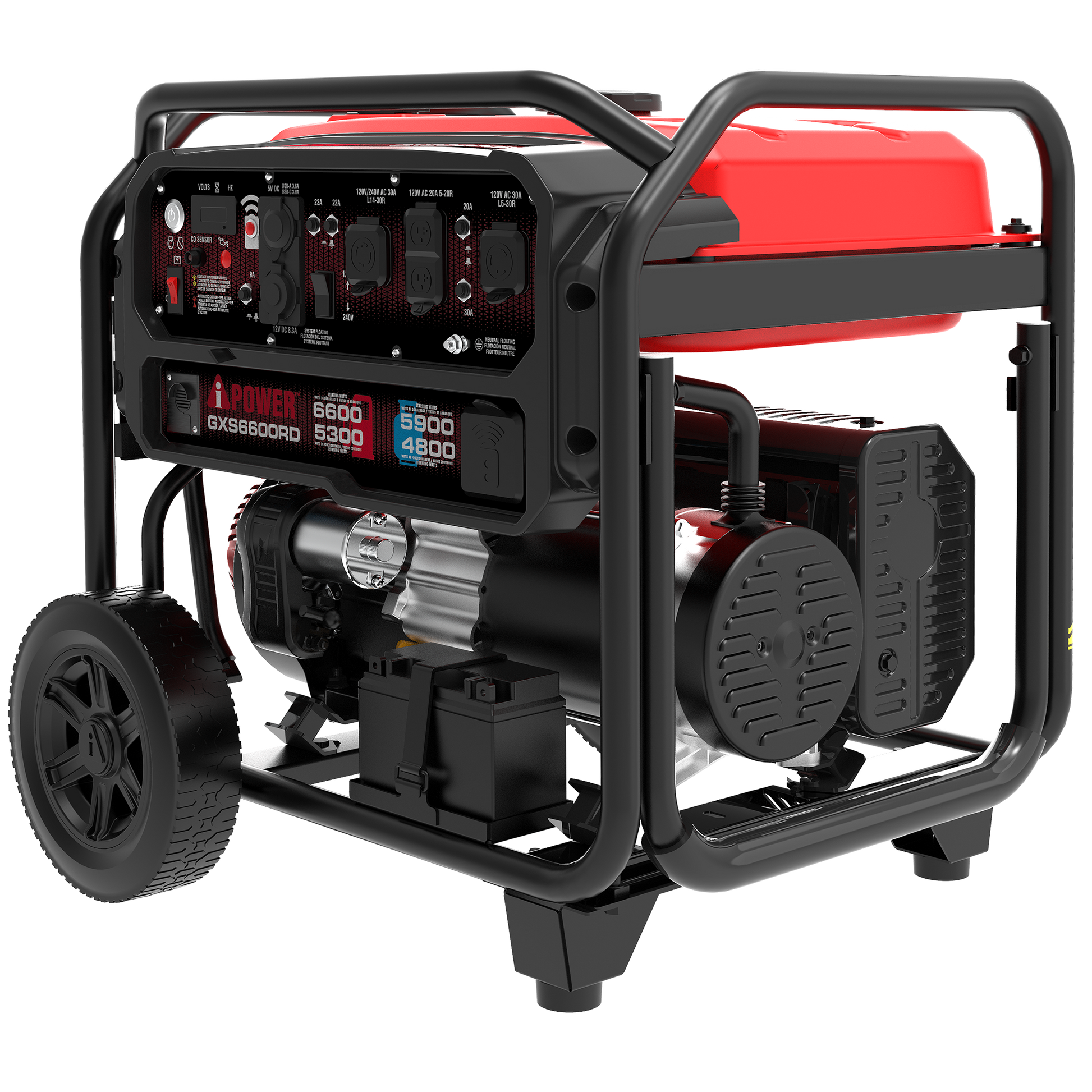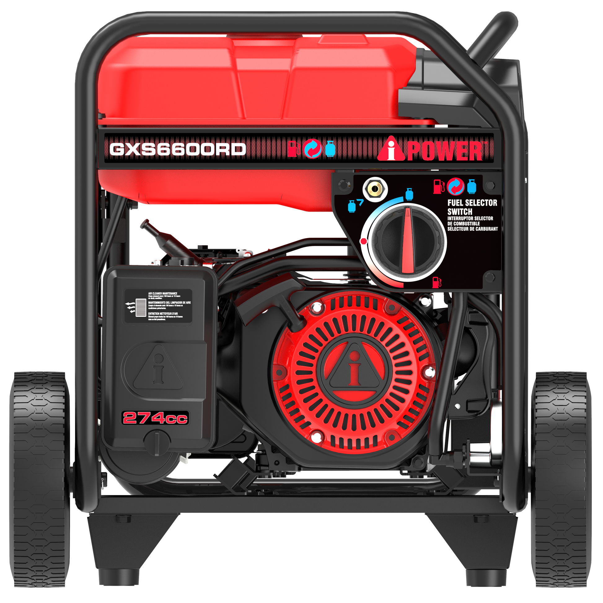 Featuring a 274cc OHV engine with cast iron sleeve and low oil shutdown, the GXS6600RD Remote Dual Fuel Portable Generator has 6,600 starting watts and 5,300 running watts on gasoline and 5,900 starting watts - 4,800 running watts on propane. It offers simple starting through recoil, electric, and remote start, plus a battery and fob is included.