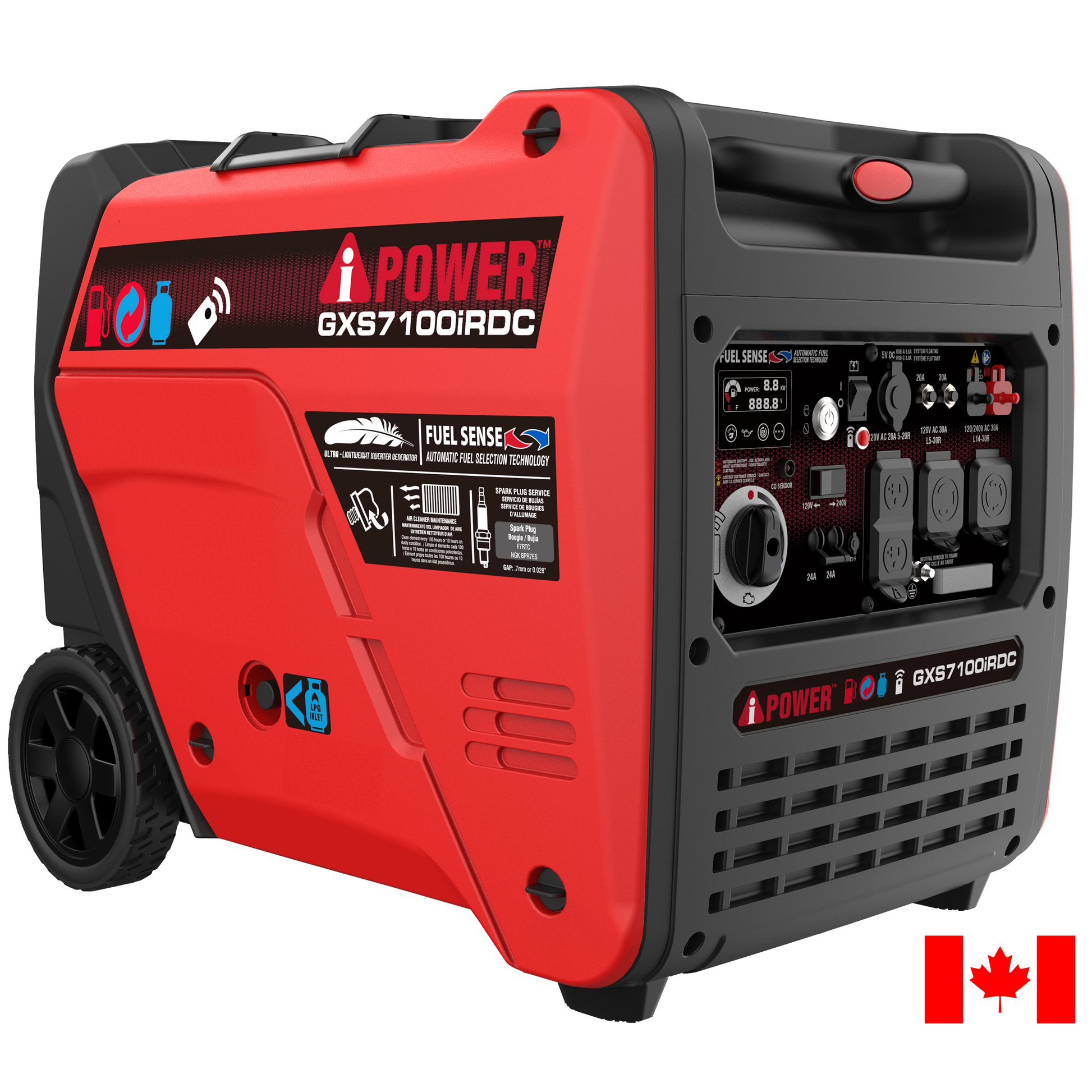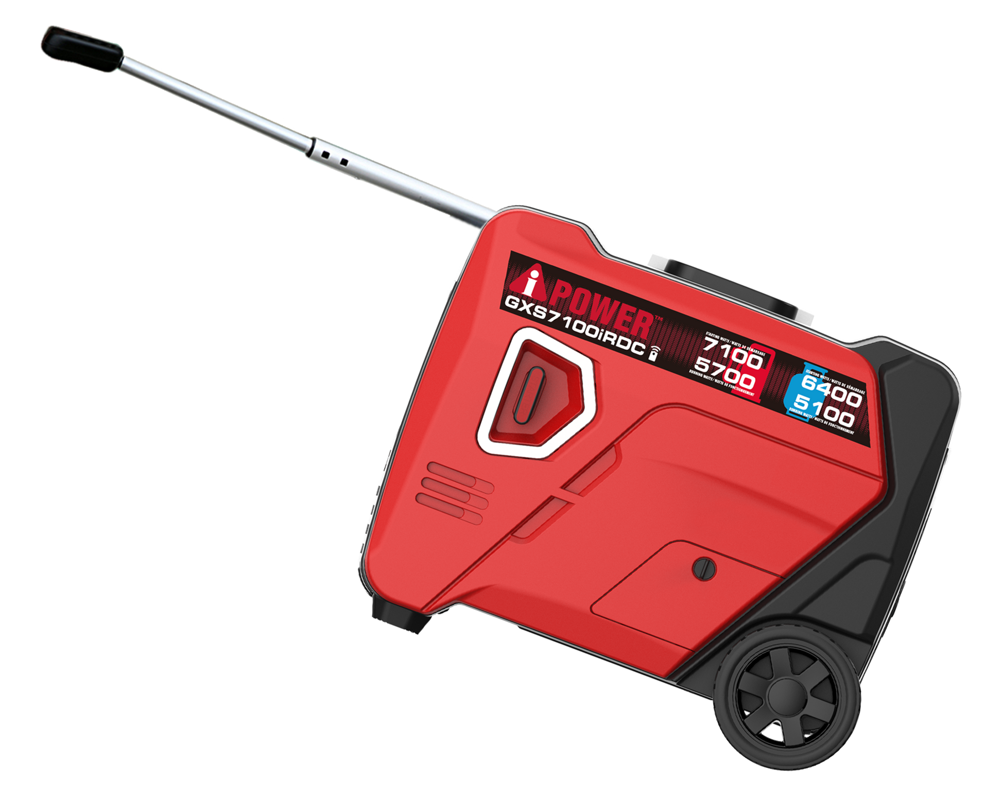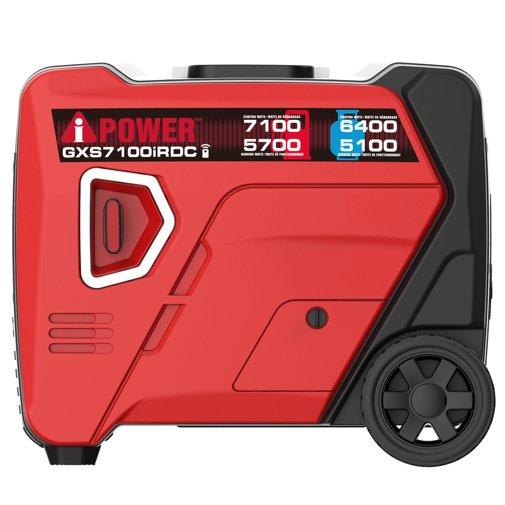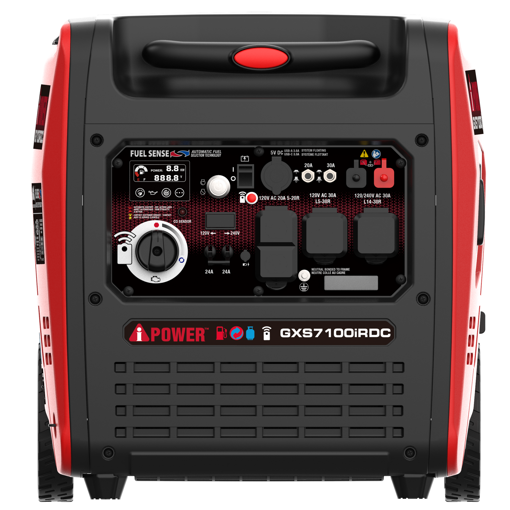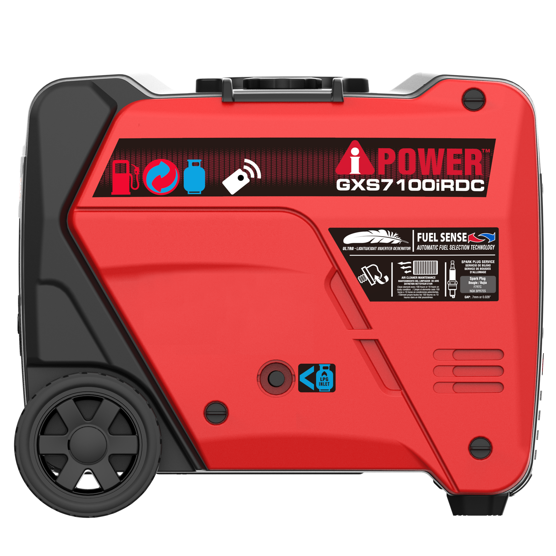 Powered by a 322cc OHV high performance 4 cycle engine with 3.6 gal fuel tank featuring both recoil and push button electric start, the A-iPower GXS7100iRDC Dual Fuel Remote Control Generator runs on gasoline or propane fuel giving you flexibility while out on the road or during an emergency. The unit has 7,100 starting watts with 5,700 running watts on gasoline and 6,400 starting watts with 5,100 running watts on propane.