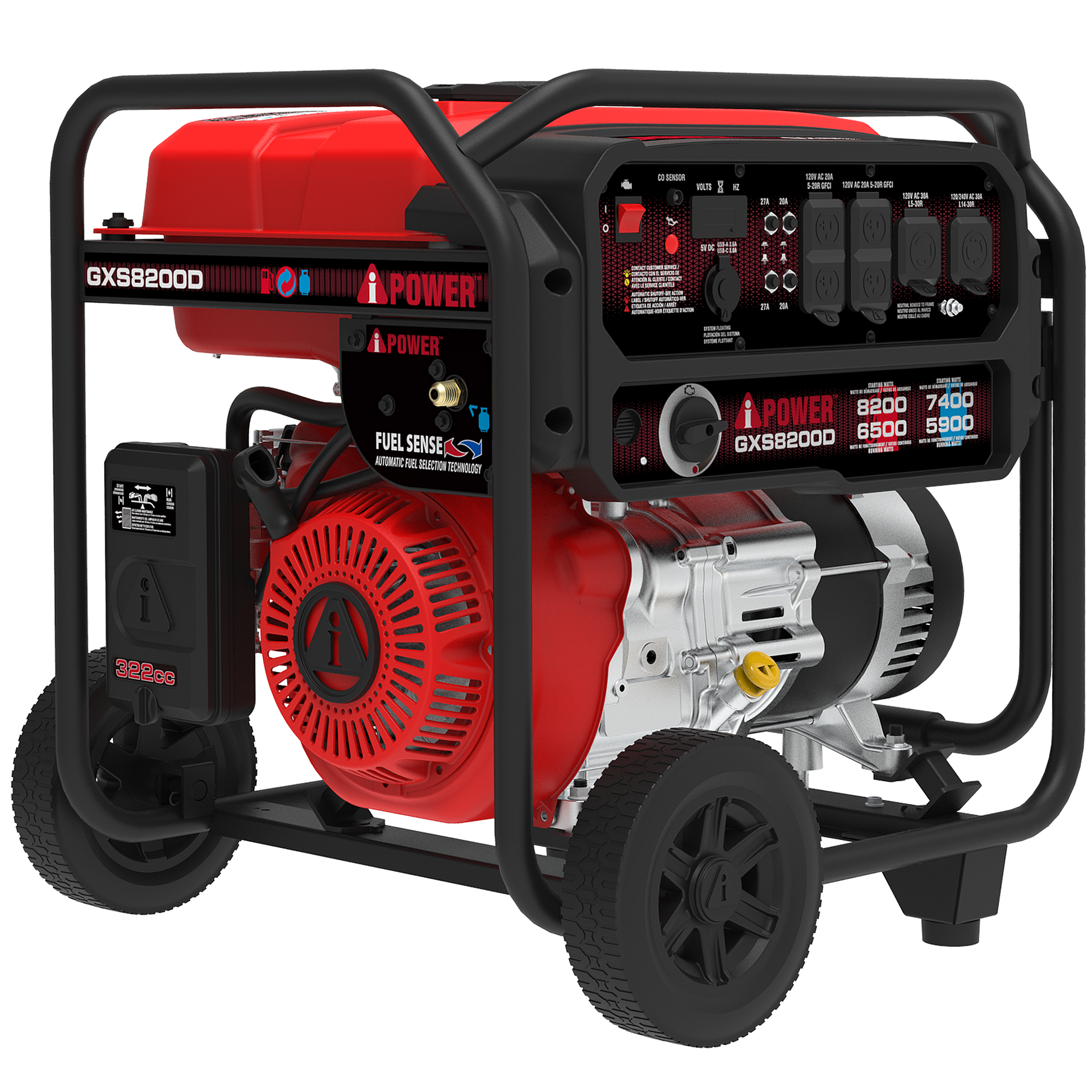 The A-iPower GXS8200D 8200-watt dual fuel generator has a 322cc performance series OHV engine with a cast iron sleeve and low oil shutdown. Offering 8,200 starting watts and 6,500 running watts on gasoline and 7,400 starting watts and 5,900 running watts on propane, the unit has a 6.3-gallon fuel capacity for up to 17 hours of runtime, offering flexibility while out on the road or during an emergency.