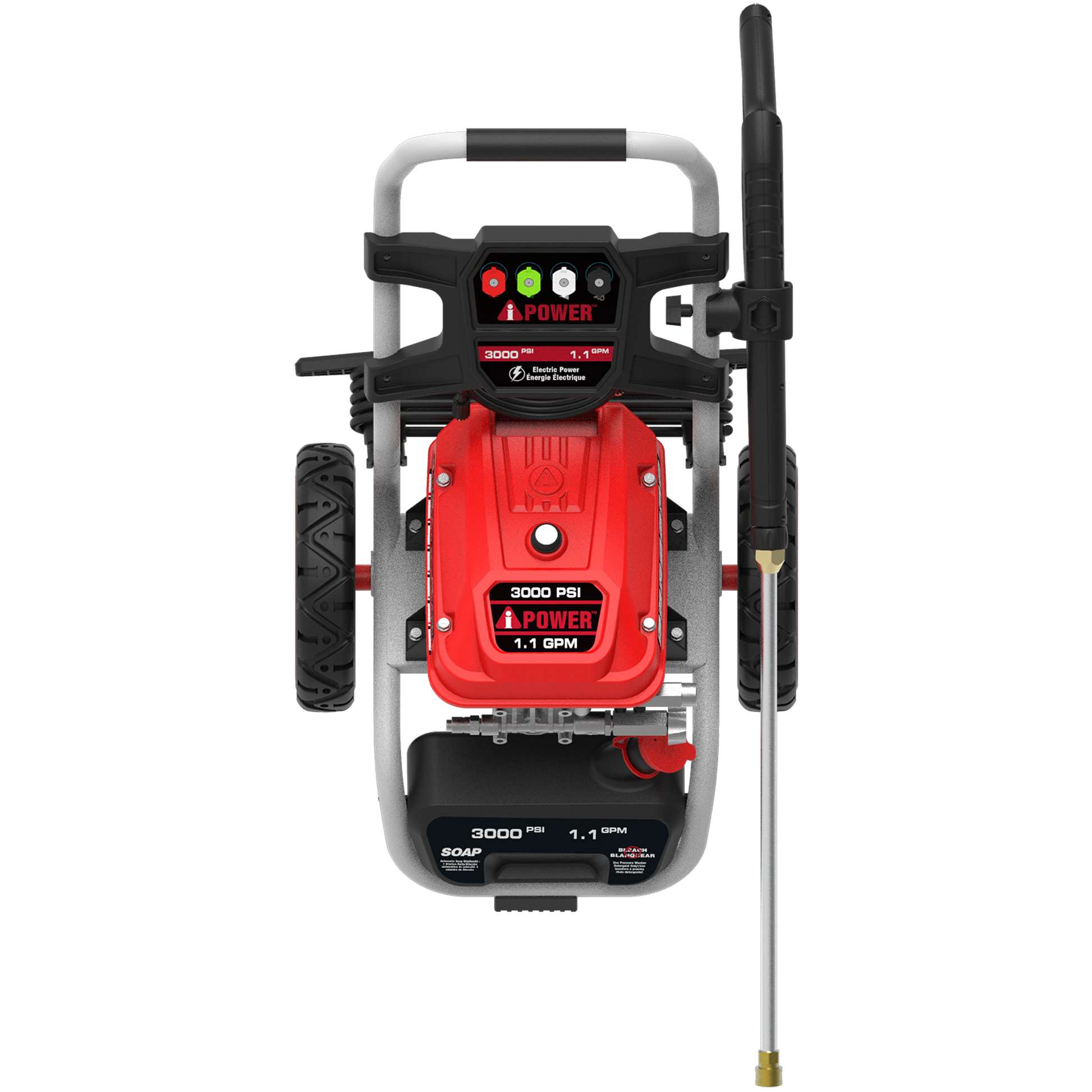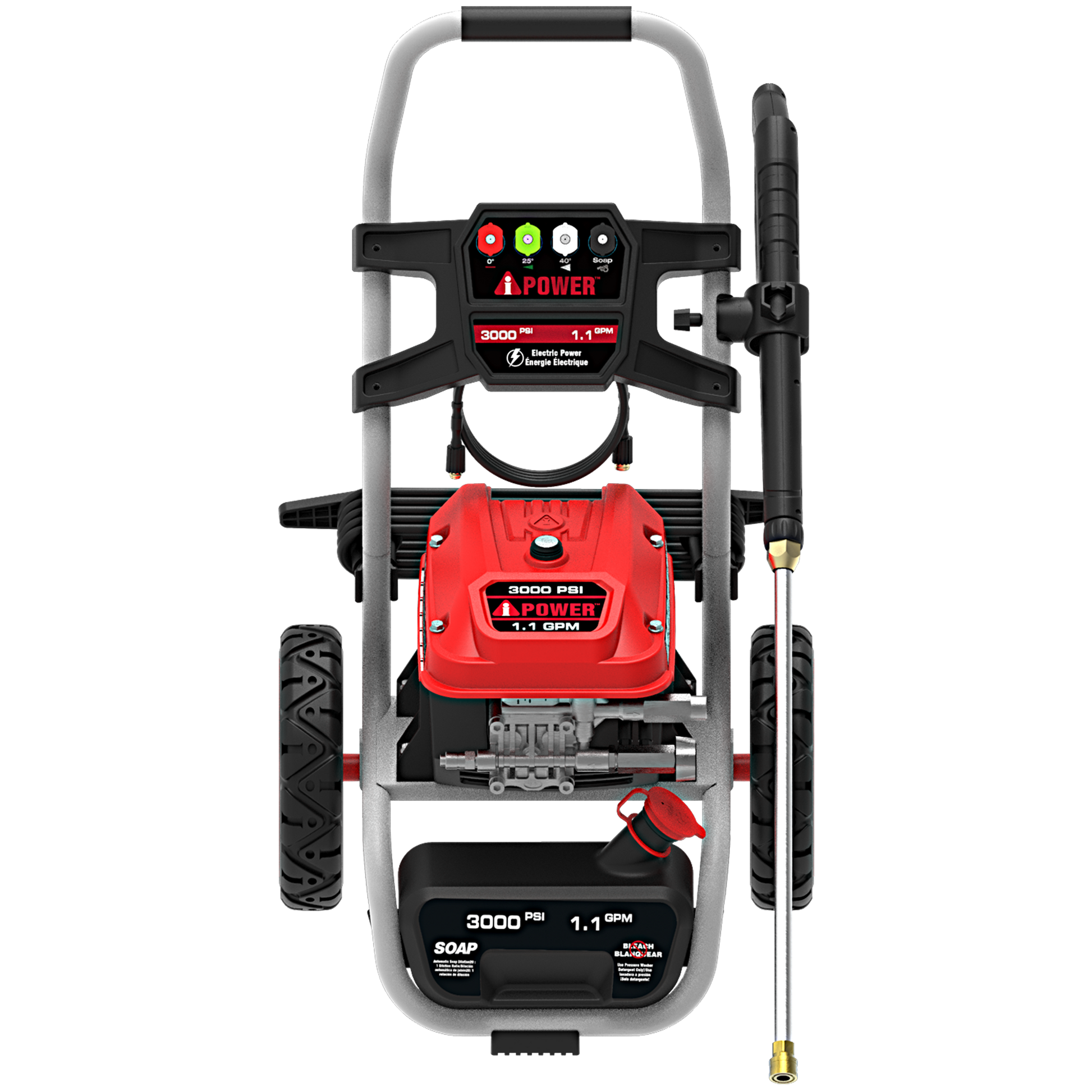The A-iPower PWE3000 Electric Pressure Washer, featuring a GFCI-equipped power cord with a push button starting system for quick, safe, and convenient use, offers 3000 PSI at 1.1 GPM for outstanding cleaning power.