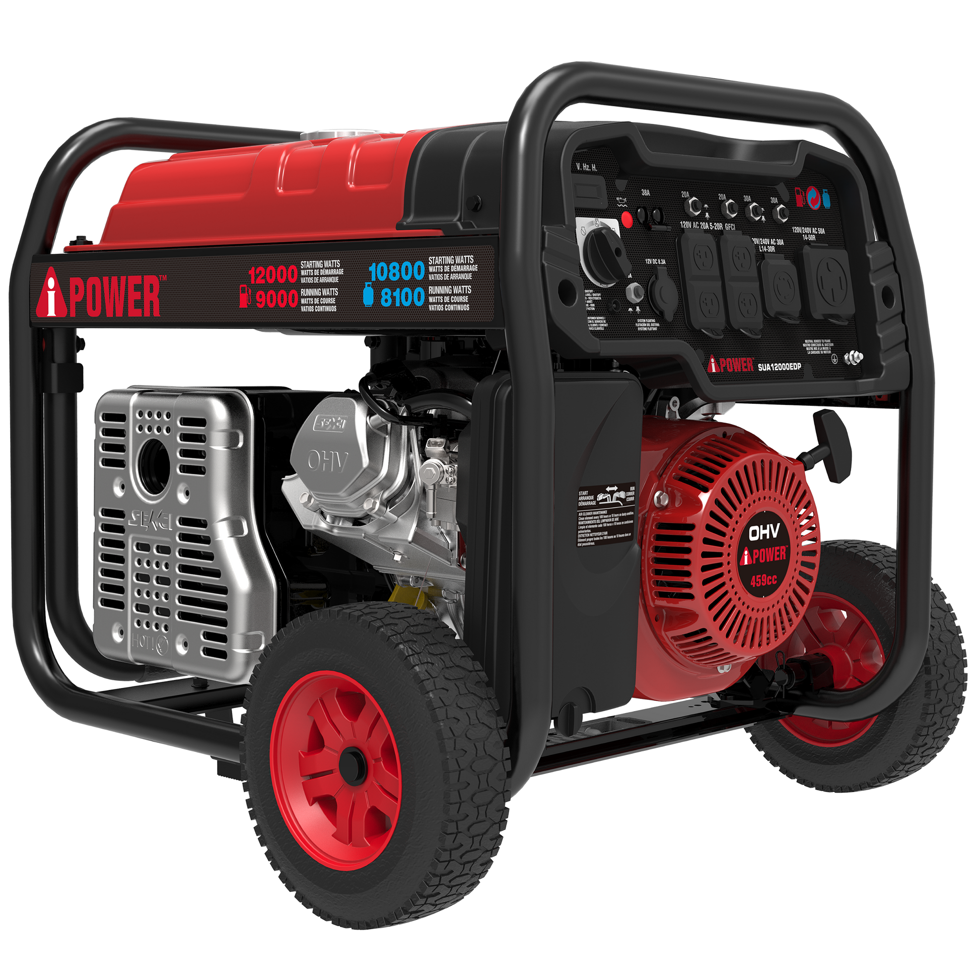 With a 459cc OHV performance series engine with a cast iron sleeve and low oil shutdown, the A-iPower SUA12000EDP Dual Fuel Generator offers 12,000 starting watts with 9,000 running watts on gasoline and 10,800 starting watts with 8,100 running watts on propane. The 6.6-gallon fuel tank has an extended run time of 14 hours at 25% load.