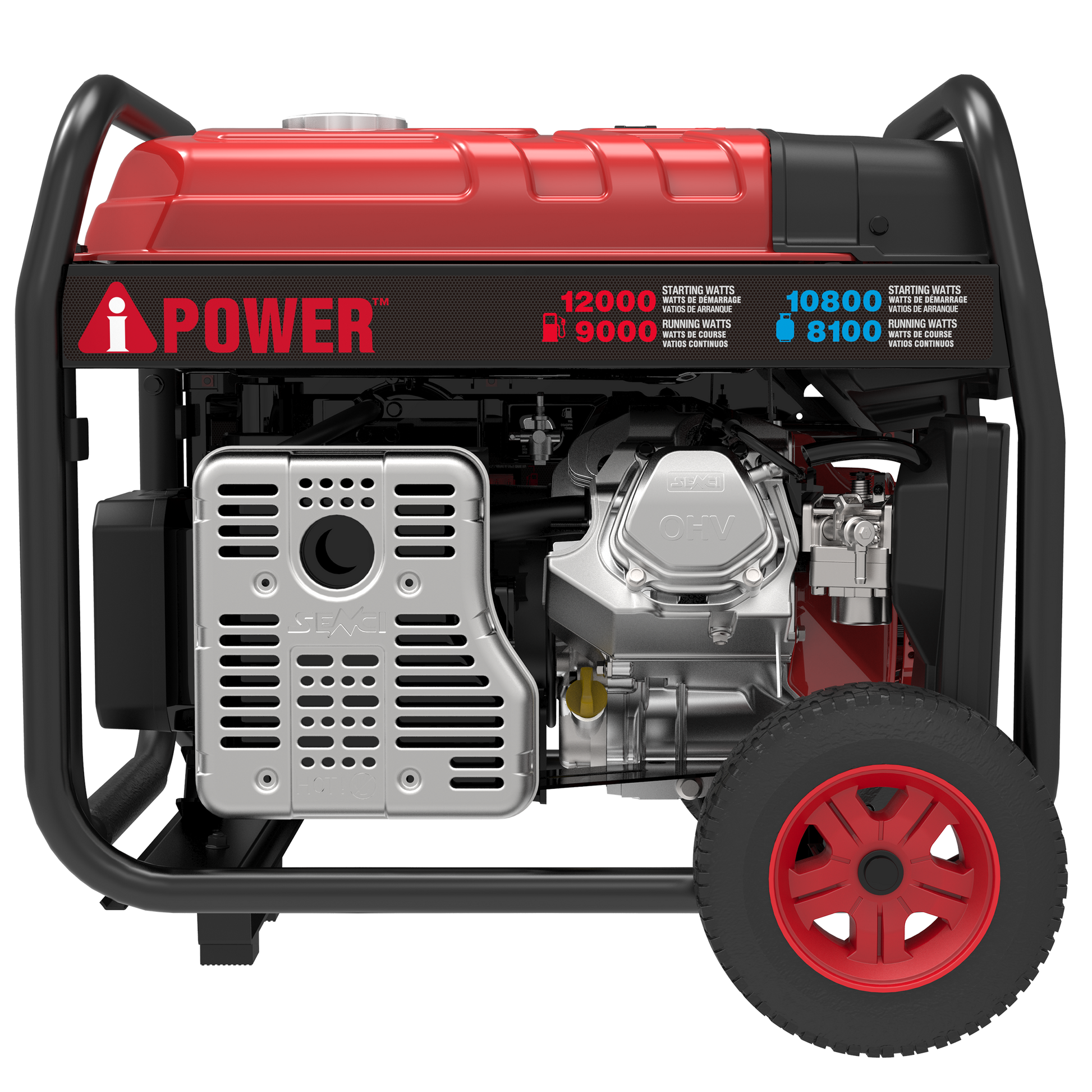 - High Output: 12,000 starting watts - 9,000 running watts on gasoline; 10,800 starting watts - 8,100 running watts on propane