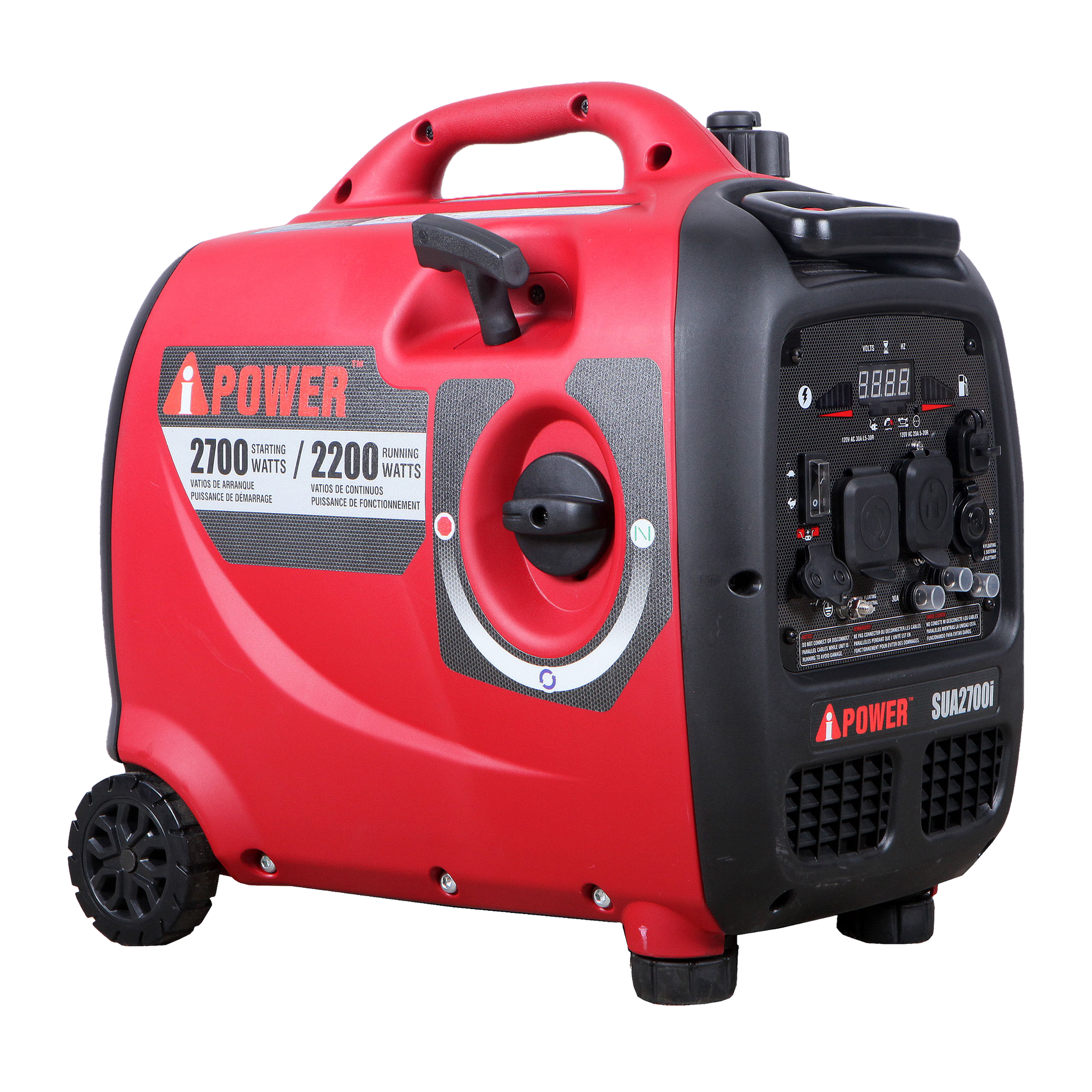 The A-iPower SUA2700i Portable Inverter Generator produces up to 2700 starting watts and 2200 running watts. The heavy duty 98cc 4-Stroke OHV engine is constructed of a durable cast iron sleeve, 0.99 gallon (3.75L) gas tank, keeping you powered through the day, automatic low oil shutdown. Transfer Switch Ready L5-30R and 5-20R to power your major appliances like the air conditioner, refrigerator, and sump pump as well as any lights or entertainment centers all at the same time with a single cord hookup. Data Center displays voltage, frequency, lifetime hours, power and fuel meter to keep you up to date with real-time information and regular maintenance. Conveniently portable with an included set of heavy duty flat-free wheels, telescopic handle. Super quiet operation, operating as low as 63 dBA which is quieter than the average conversation. Safely powers sensitive electronics like plasma/LCD televisions, laptops, tablets, and mobile devices by producing clean, stable power at less than 3% THD. If you need more power, the SUA2700i is parallel capable and can be paired with another A-iPower Inverter Generator using the Parallel cable. The SUA2700i has built-in safety features including low oil shutdown and overload protection while backed by a 3-year limited warranty and lifetime technical support.