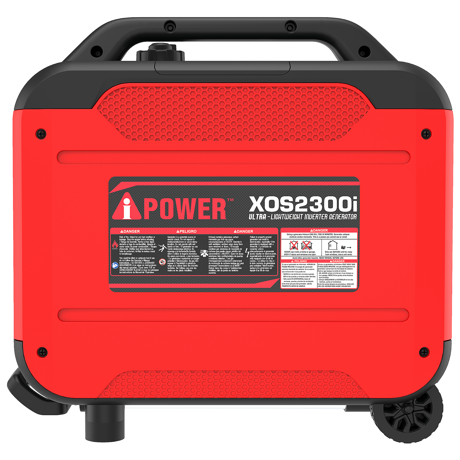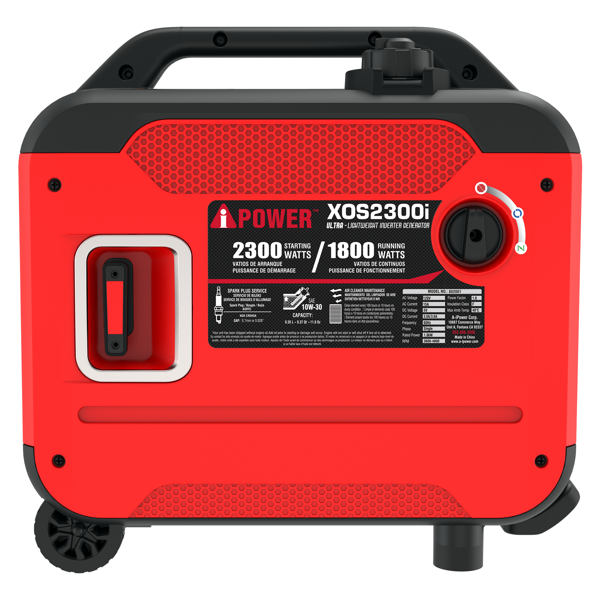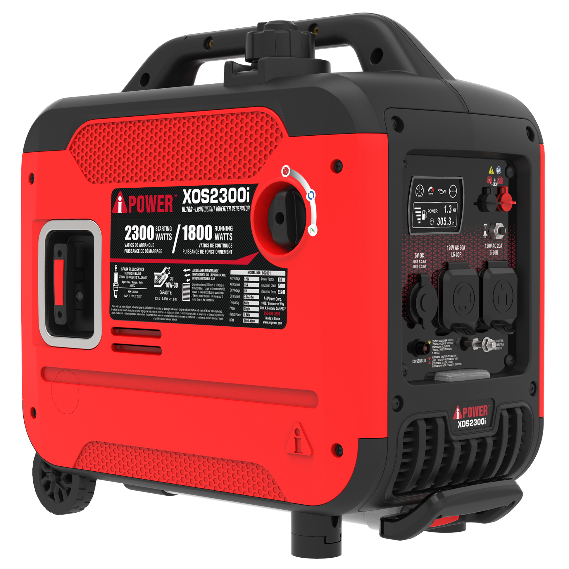 The EPA Certified A-iPower XOS2300i inverter generator, lightweight at just 40.8 pounds, is ANSI/PGMA G300 Compliant and includes CO Sensor Shutdown. With 2300 Starting and 1800 Running Watts using gas, the .9-gallon gas tank provides up to nine hours of runtime.