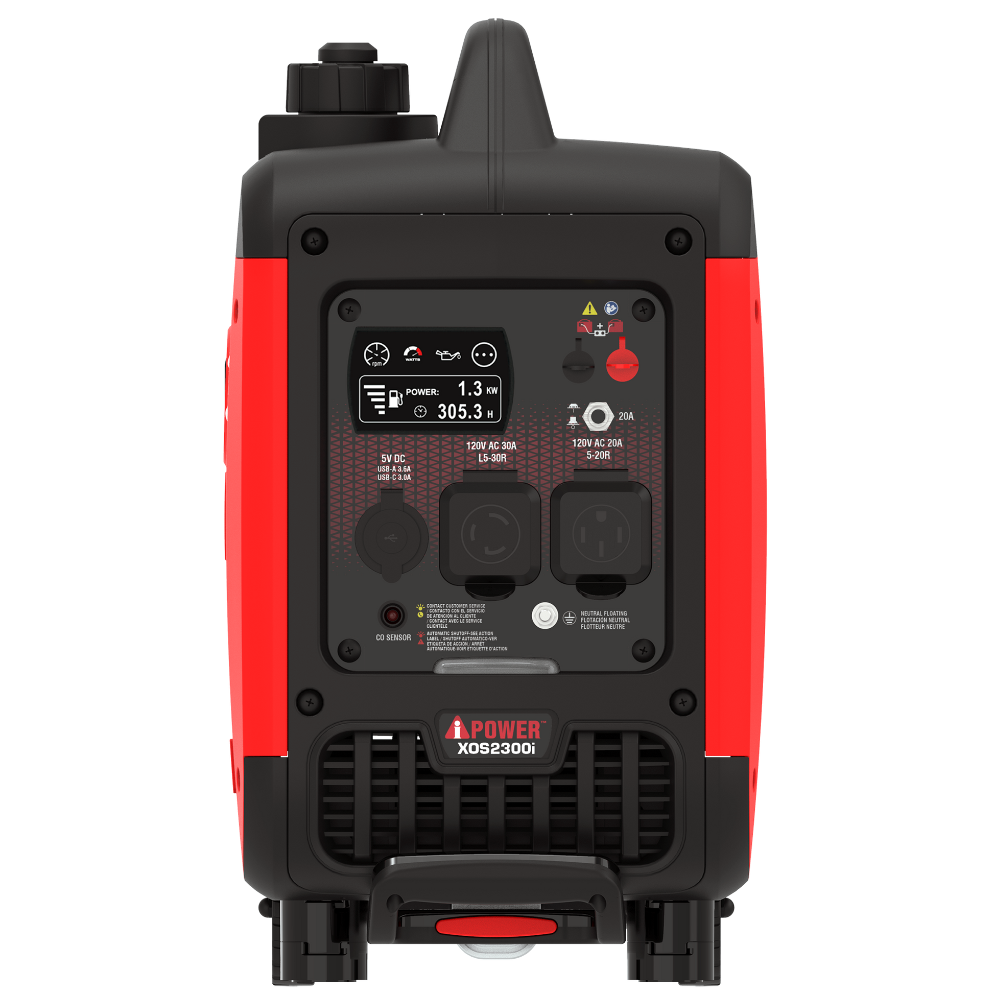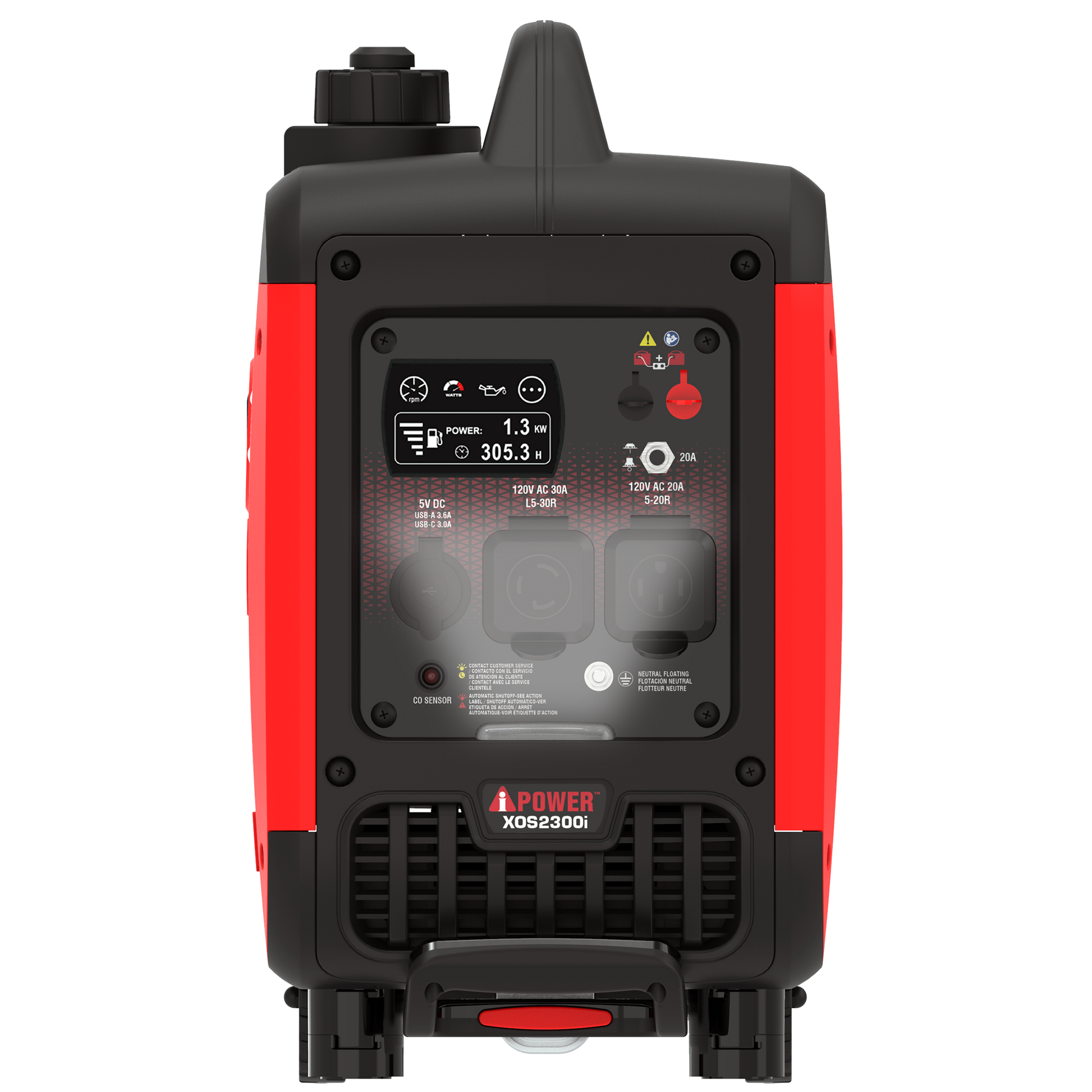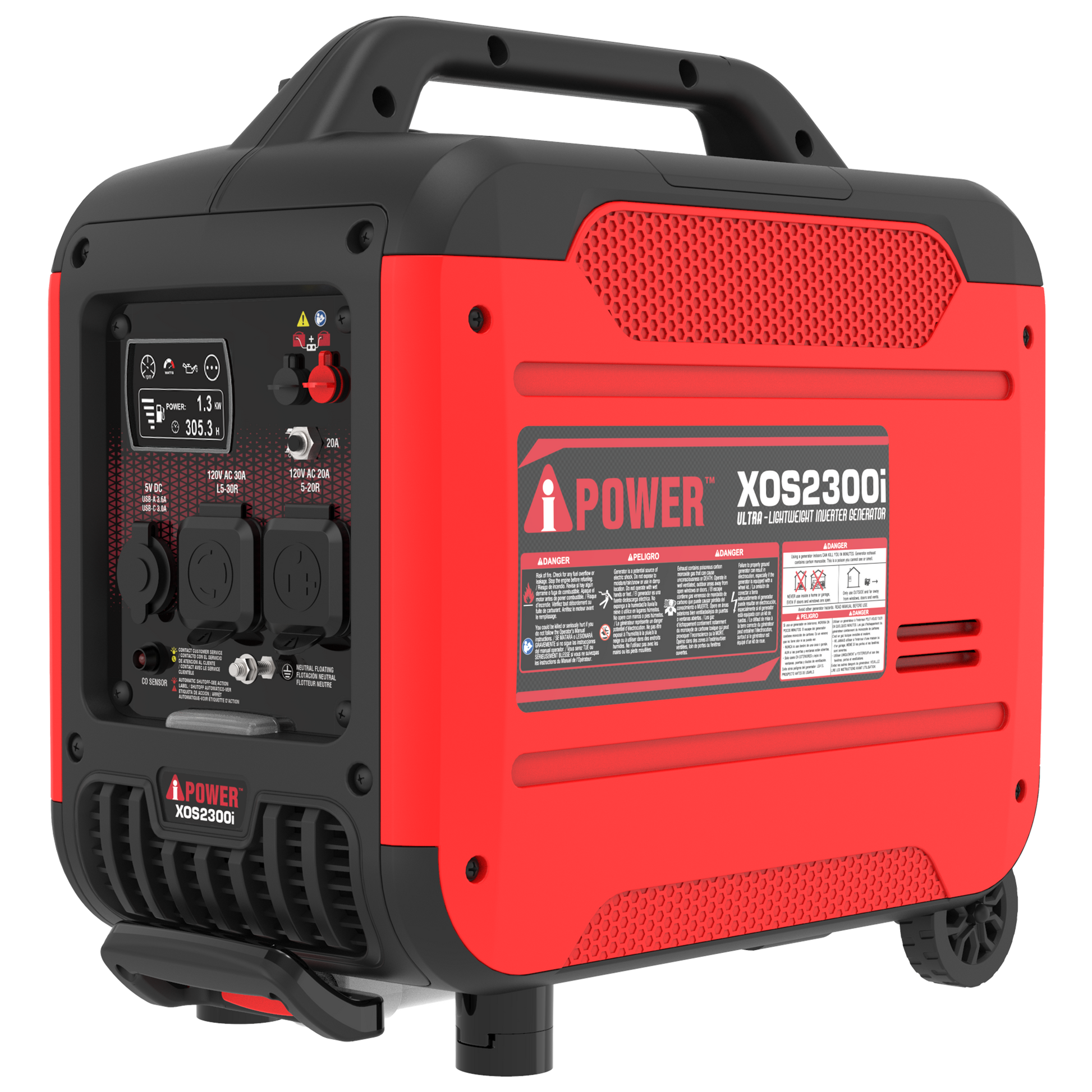 The EPA Certified A-iPower XOS2300i inverter generator, lightweight at just 40.8 pounds, is ANSI/PGMA G300 Compliant and includes CO Sensor Shutdown. With 2300 Starting and 1800 Running Watts using gas, the .9-gallon gas tank provides up to nine hours of runtime.
